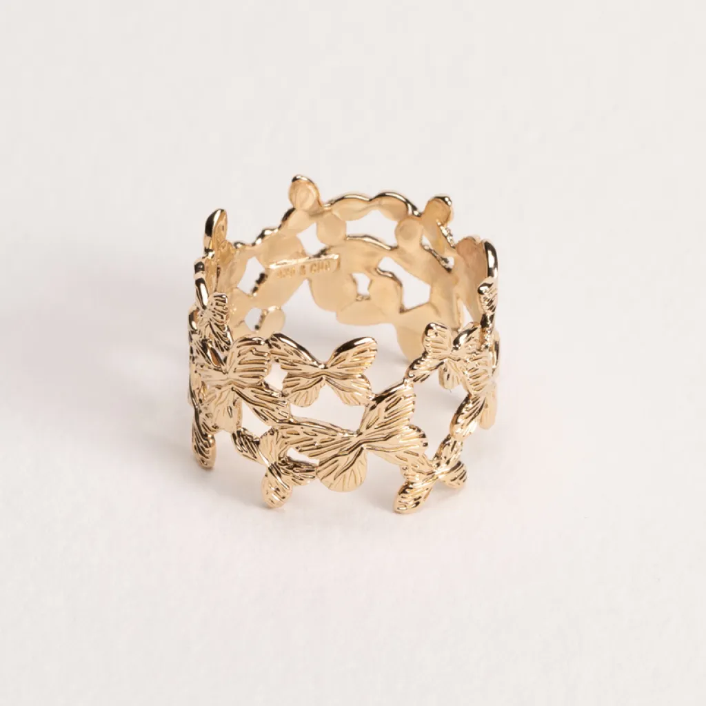 La Bague Scarlett, une création captivante de Ana & Cha, est un hommage à la beauté de la nature. En plaqué or 3 microns, cette bague large est ornée de nombreux petits papillons, pour un effet féerique et raffiné.