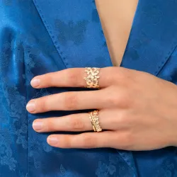 Inspirée par la nature, la Bague Scarlett de Ana & Cha transforme votre main en un jardin enchanteur. Cette bague large en plaqué or 3 microns présente une myriade de petits papillons délicats, créant un effet magique et aérien.