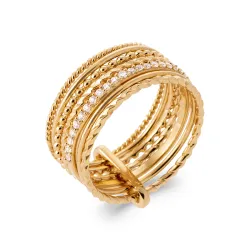 Les oxydes de zirconium, méticuleusement sertis sur chaque anneau de cette bague, imitent à la perfection la brillance des diamants, ajoutant une lueur étincelante à votre style. Le plaquage or de 3 microns offre une finition luxueuse et durable, assurant que votre bijou conserve son éclat doré au fil du temps.