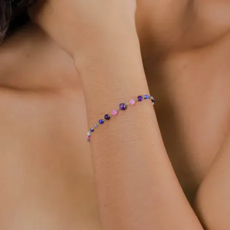 Fabriqué en laiton, ce bracelet offre une base solide et élégante pour les mini perles qui ornent votre poignet avec subtilité. Les perles d'améthyste rehaussent le design avec leur douce teinte violette et sont réputées pour leurs vertus apaisantes, améliorant l'équilibre émotionnel et la clarté mentale. Les perles de lapis-lazuli, d'un bleu profond, symbolisent la sagesse et la vérité, tandis que les perles de verre apportent une touche pétillante au bracelet.