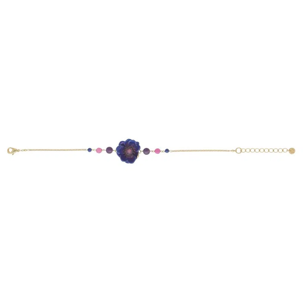 Le bracelet est composé de laiton, matériau choisi pour sa robustesse et sa beauté intemporelle. Au centre, une fleur subtilement réalisée en résine colorée bleu violet s'impose comme le point focal du design. Cette couleur évoque la sérénité et l'inspiration, ajoutant une note douce à votre look.