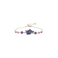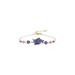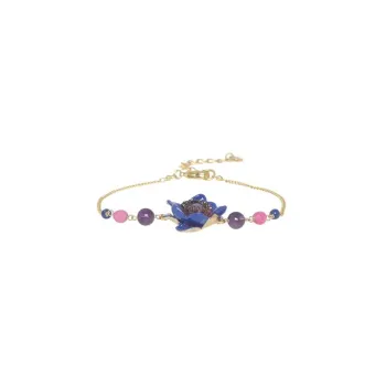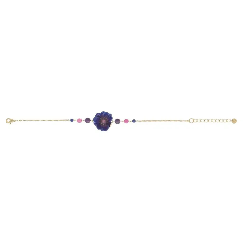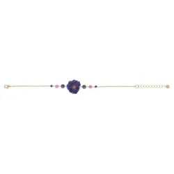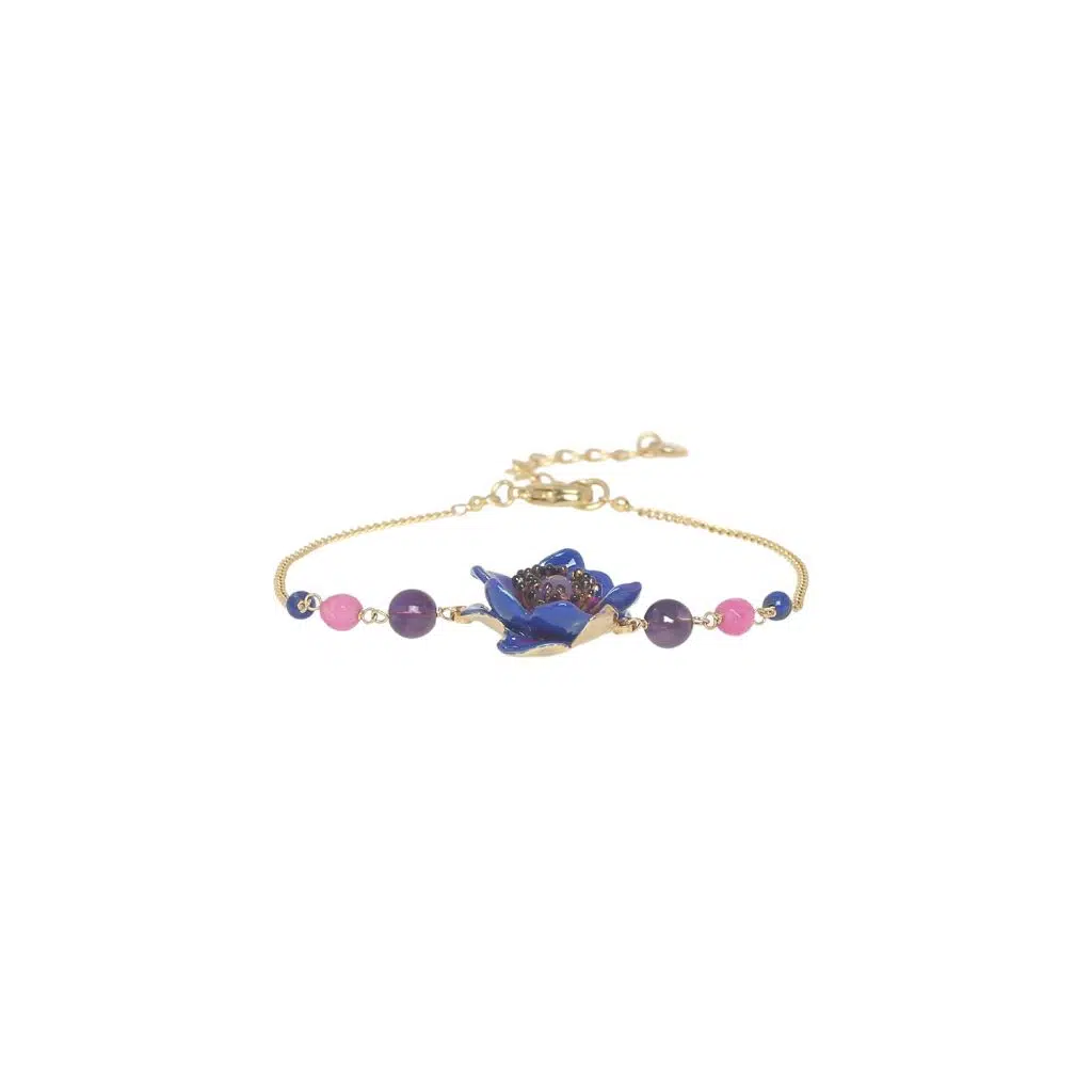 Le Bracelet Mélina est une création unique et élégante signée Franck Herval. Orné d'une fleur bleu violet en résine et rehaussé de pierres d'améthyste et de lapis-lazuli, ce bracelet en laiton de 17 cm incarne la sophistication et le charme de la création française.