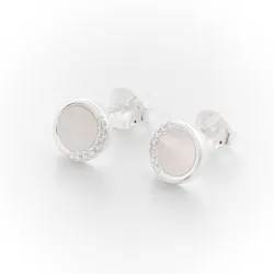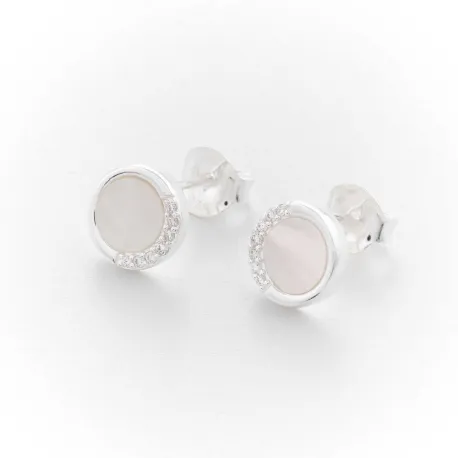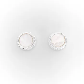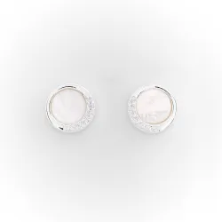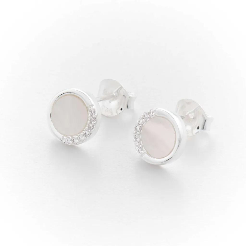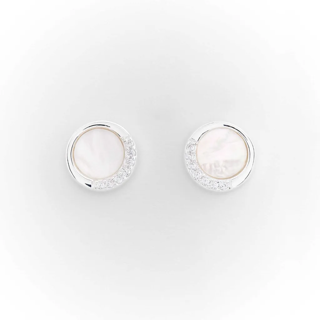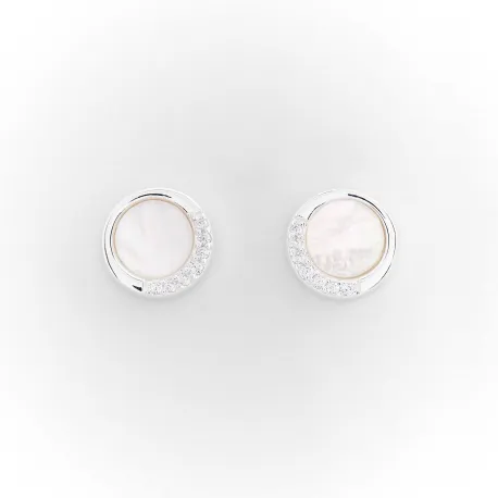 Les boucles d'oreilles puce Lua, signées Canyon, sont en argent 925 et présentent une nacre blanche ronde ornée d'oxydes blancs. Avec un diamètre de 0.9 cm, elles ajoutent une touche d'élégance lumineuse à votre apparence.