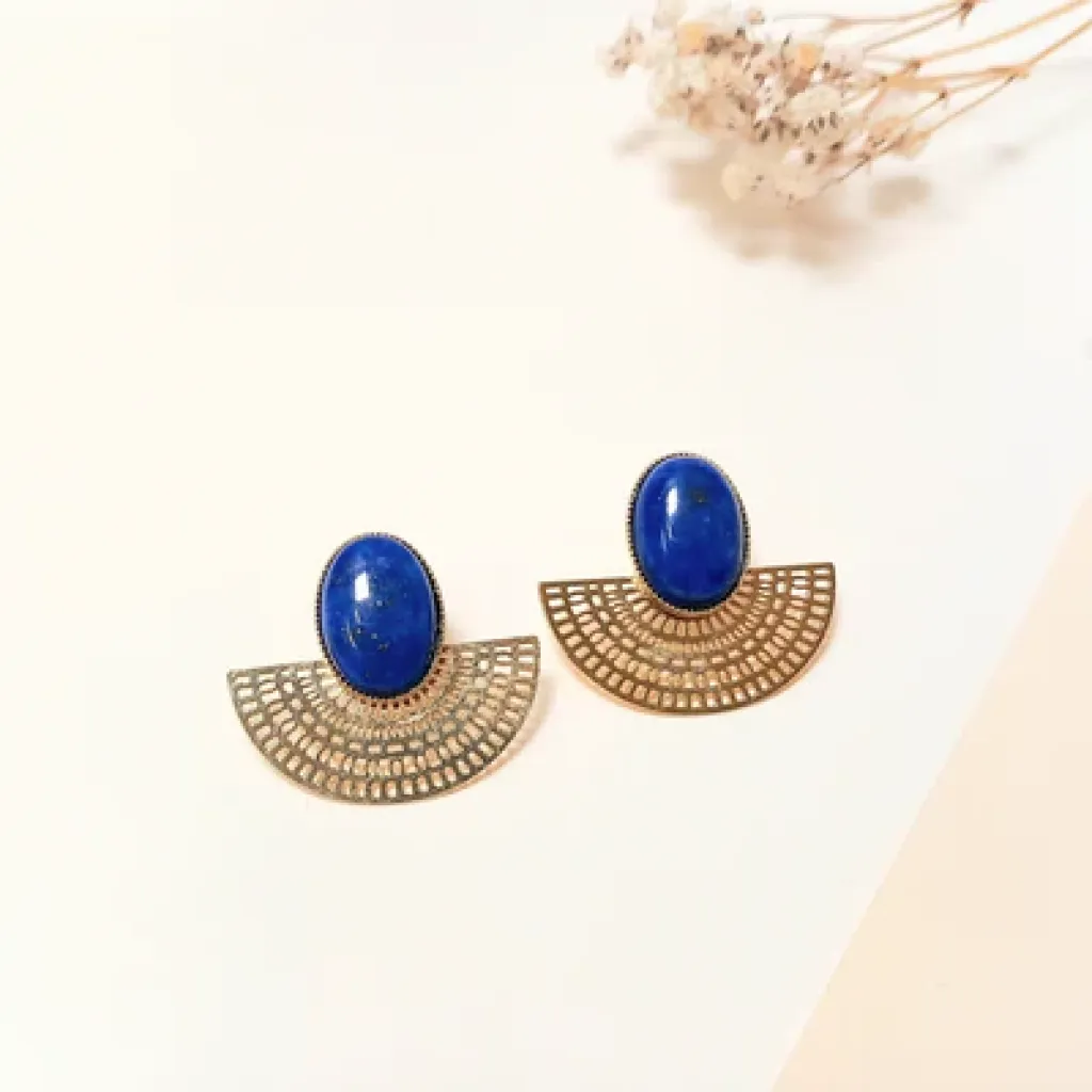 Laissez-vous envoûter par le charme des Boucles d'oreilles Azteque, une création raffinée mêlant laiton doré à l'or fin et pierres naturelles de lapis lazuli. Fabriquées en France dans les ateliers parisiens de Fabien Ajzenberg, elles ajoutent une touche de mystère et d'élégance.