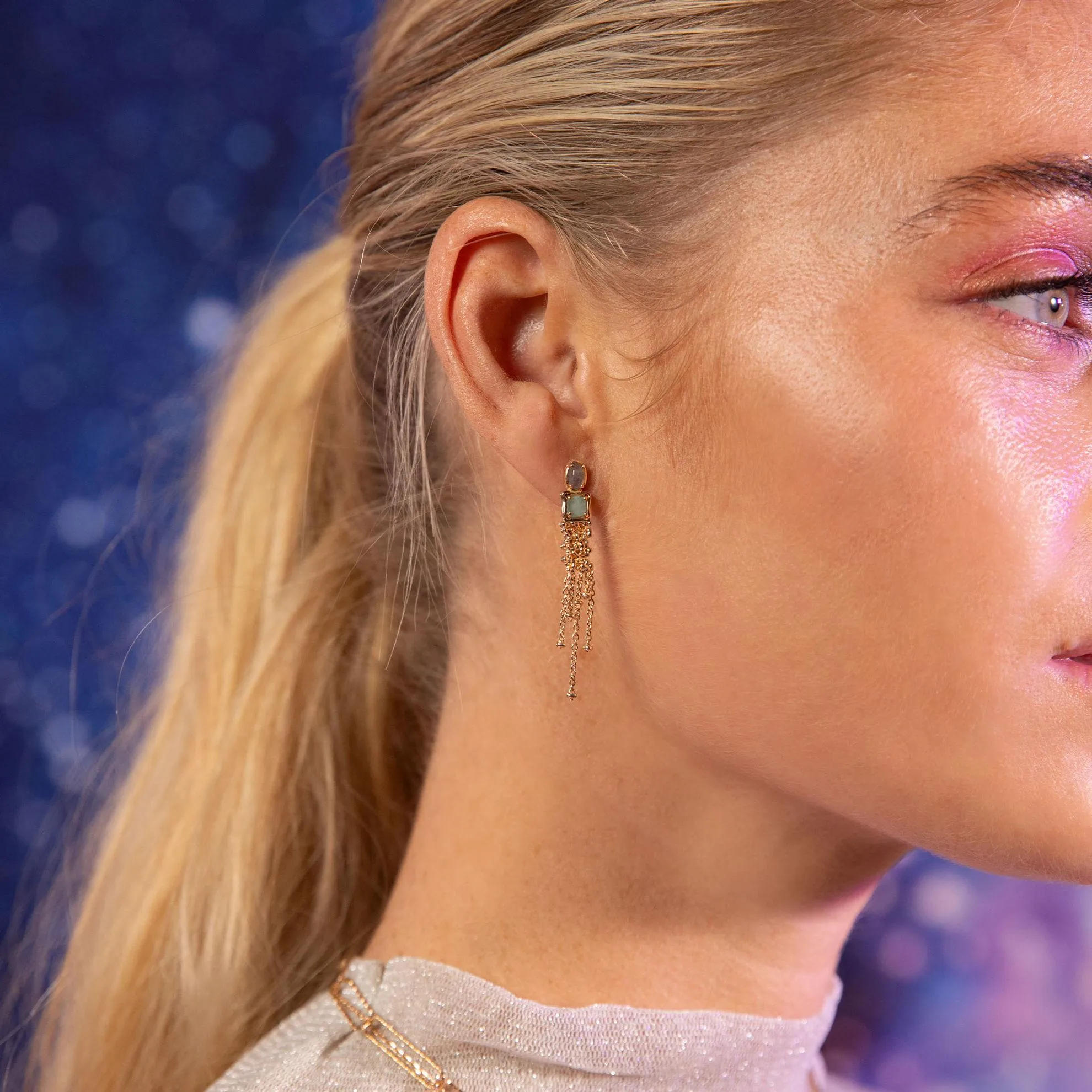 Les boucles d'oreilles Elowen de chez Ana&Cha sont une célébration céleste de couleurs et de lumières, défiant la gravité avec leur éclat saisissant. Serties de quatre pierres fines, l'amazonite et la labradorite, ces boucles ajoutent une dimension magique à votre apparence, comme si vous portiez un morceau du ciel étoilé.