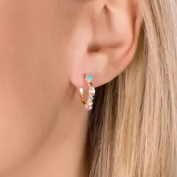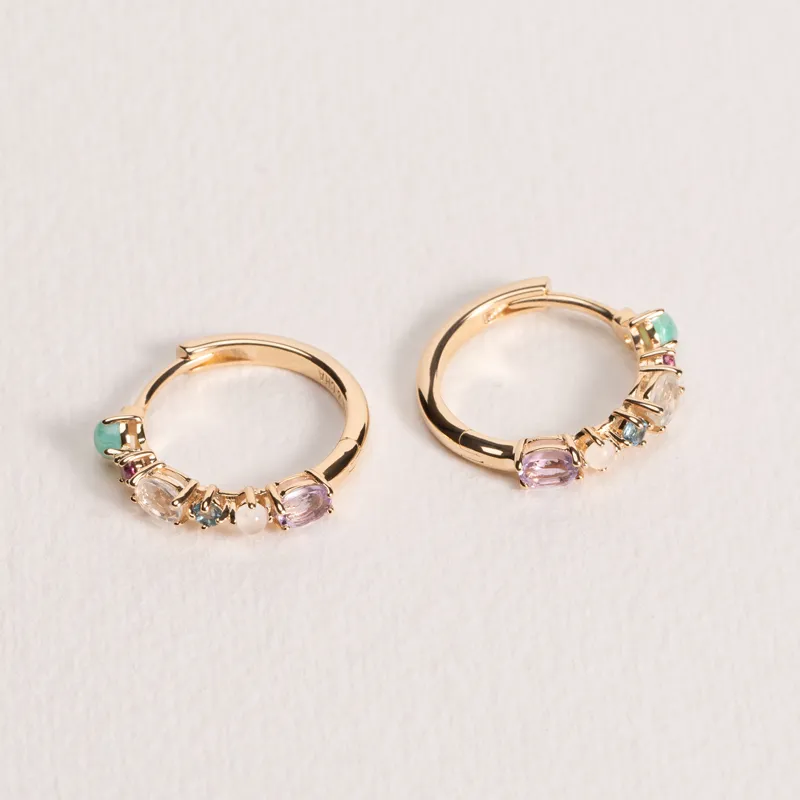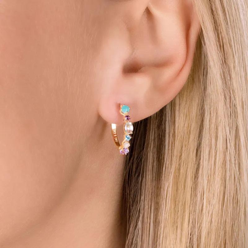 Découvrez les créoles Dahlia, une création française d'Ana & Cha en plaqué or 3 microns. Ornées de pierres précieuses telles que l'Amazonite, la Rhodolite, la Topaze Bleue, l'Aventurine, l'Améthyste Violette et la Pierre de Lune, ces bijoux vous enveloppent de couleurs et d'élégance.