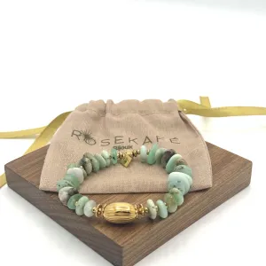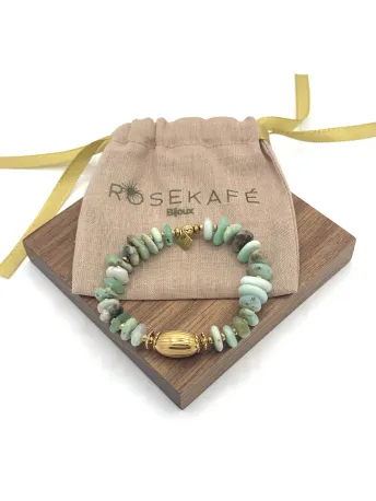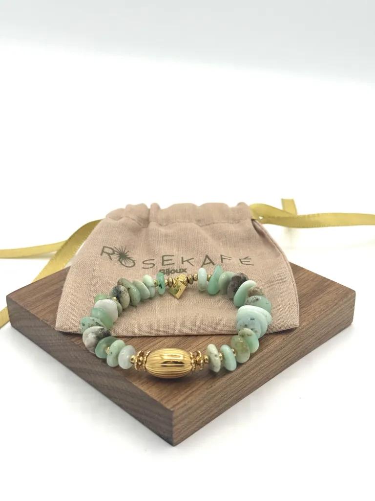 Découvrez la beauté apaisante du bracelet Arya chrysoprase, une création subtile signée par la maison française Rosekafé. Ce bijou, orné de pierres de chrysoprase, est célèbre pour ses propriétés énergétiques qui favorisent la paix intérieure et la croissance personnelle. Avec sa couleur vert tendre, la chrysoprase apporte une touche revitalisante et harmonieuse à votre style.