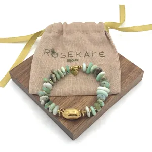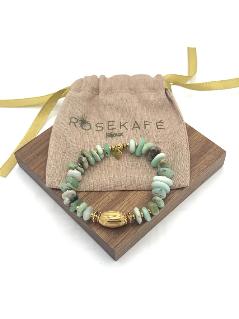 Élégance et sérénité se rencontrent dans le bracelet Arya chrysoprase de Rosekafé. Ce bracelet élastique est paré de pierres de chrysoprase et d'une base en vermeil (argent plaqué or), offrant une esthétique raffinée et une touche de fraîcheur naturelle à votre tenue.