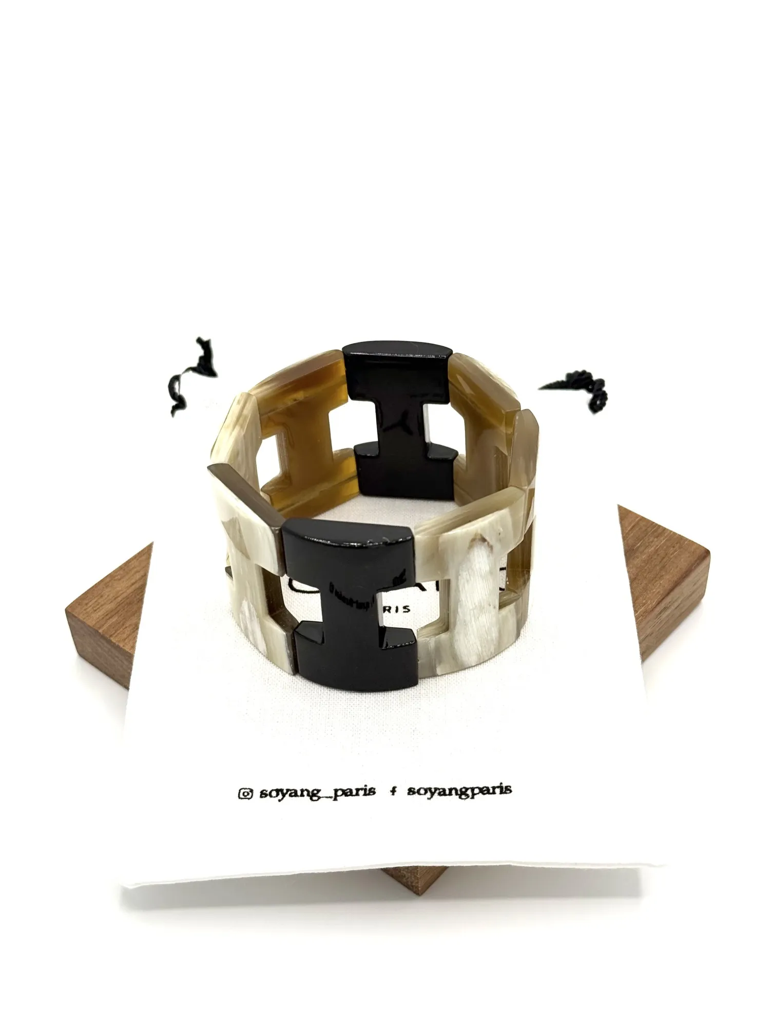 Laissez-vous séduire par ce bracelet élastique large laqué noir, une magnifique création de Soyang Paris. Fabriqué en corne de buffle et de zébu, il conjugue authenticité et modernité, tout en s'assurant d'un confort optimal grâce à son fil élastique.