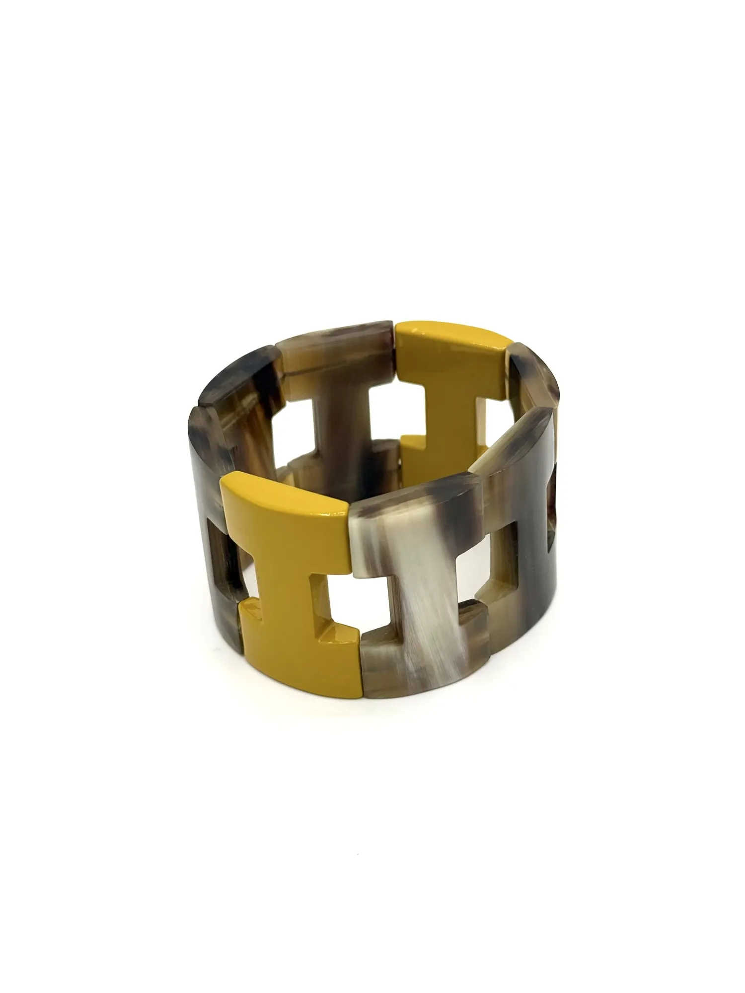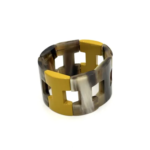 Ressentez l'attrait chaleureux du bracelet élastique large laqué ocre, une pièce unique et élégante, conçue en corne de buffle et de zébu. La teinte ocre enveloppante, associée à une finition laquée raffinée, apporte une touche de solaire et d'élégance naturelle à votre tenue, faisant de ce bracelet un accessoire incontournable.