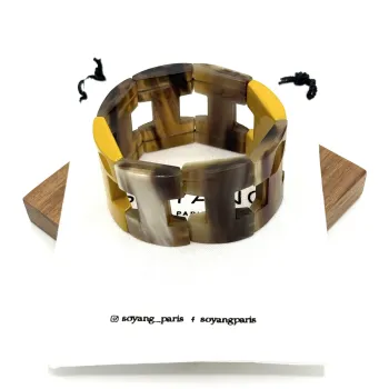 Apportez chaleur et sophistication à votre style avec ce bracelet élastique large laqué ocre, une création remarquable de Soyang Paris. Réalisé en corne de buffle et de zébu, il mêle authenticité naturelle et confort moderne grâce à son fil élastique.