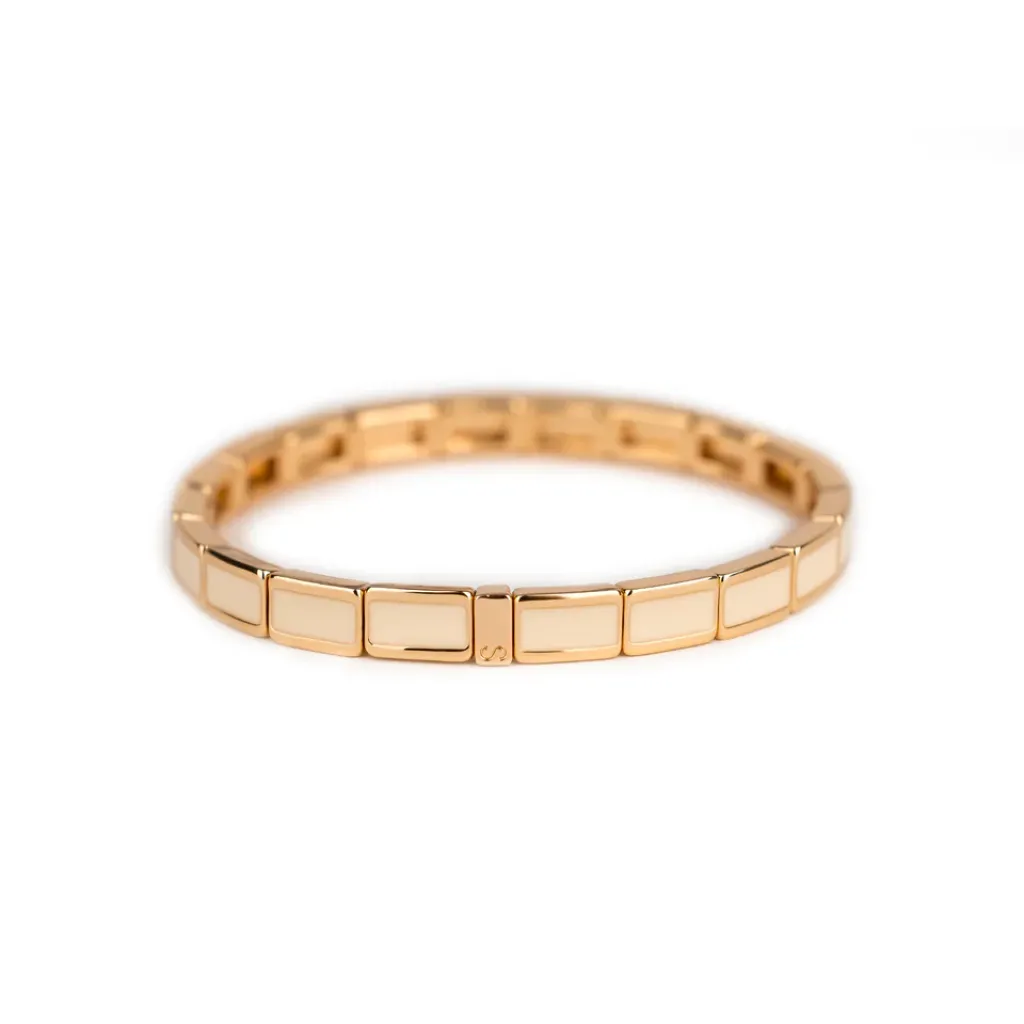 Ajoutez une touche de délicatesse à votre tenue avec le bracelet fin serti beige de Simone à Bordeaux. Fabriqué en laiton émaillé, ce bijou se distingue par ses petites perles colorées rectangulaires, monté sur un élastique unibrin pour un confort parfait.