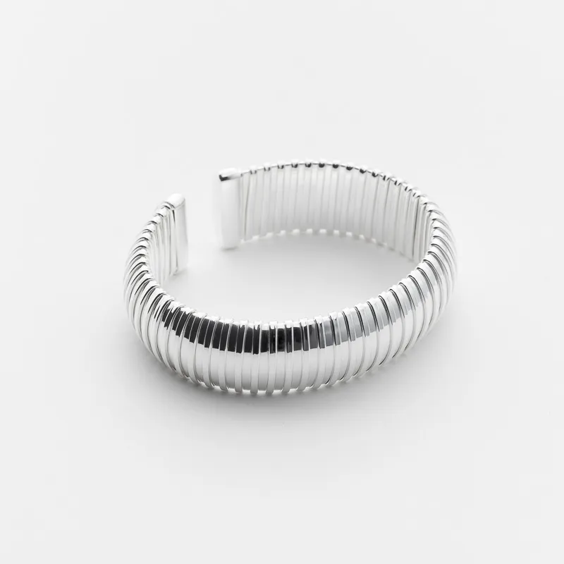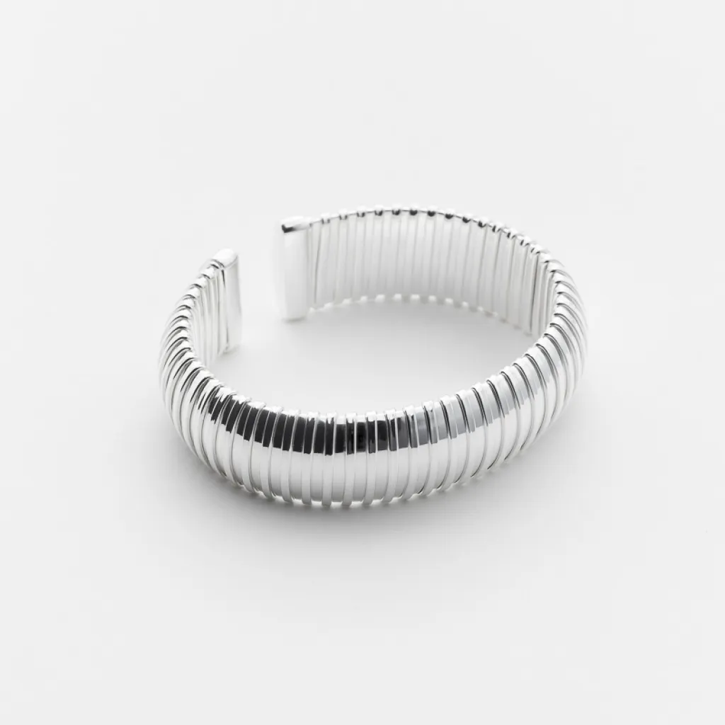 Le jonc Bridget de la marque Canyon est un bracelet en argent 925, au design bombé et souple avec des godrons plats, se terminant par un élégant bourrelet en décoration. Ce jonc ouvert offre une sophistication robuste et chic pour sublimer votre poignet.