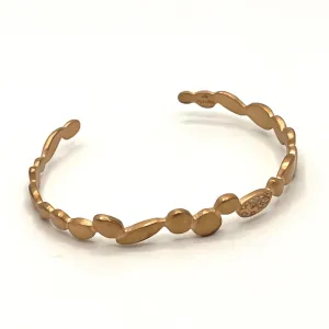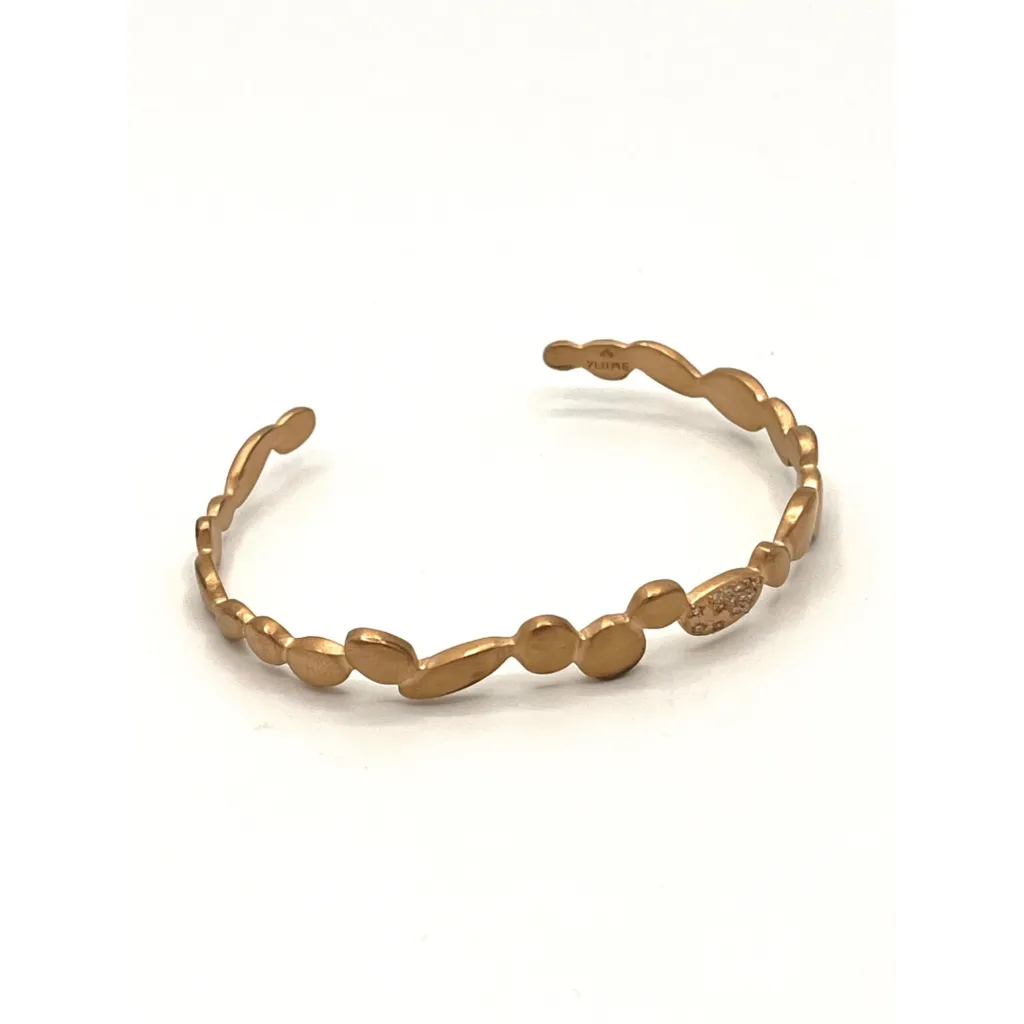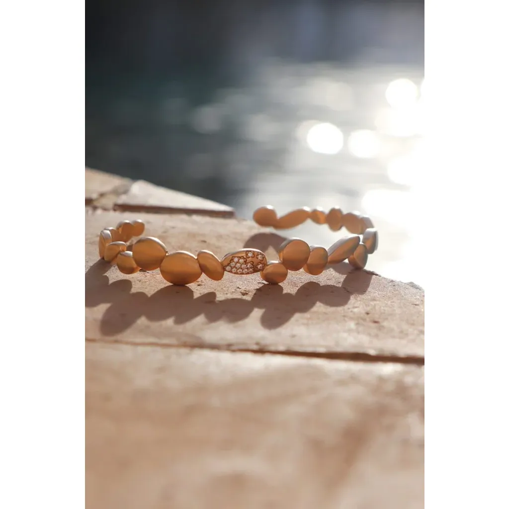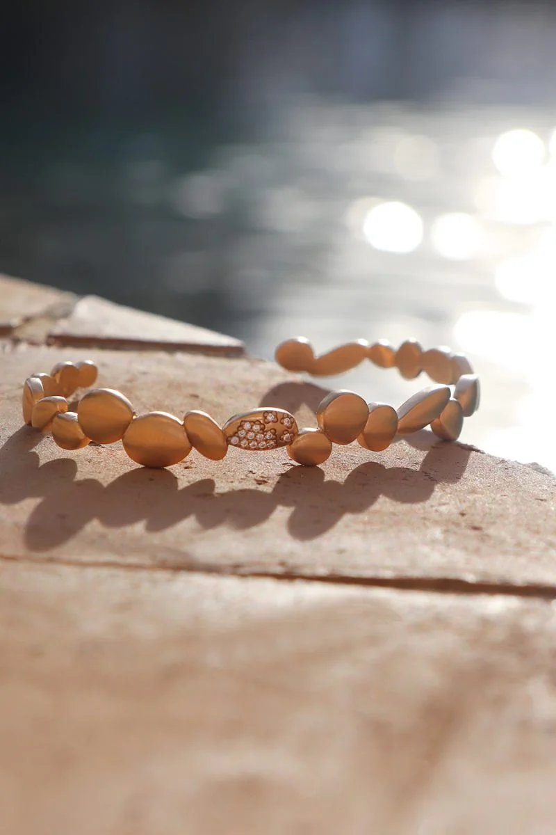 Évoquant à la fois raffinement et modernité, ce bracelet jonc en plaqué or 18 carats est une création qui incarne la délicatesse des bijoux artisanaux. Imaginé à Aix en Provence, son design soigné illustre un savoir-faire local remarquable. Le bracelet, d'un doré champagne mat, se distingue par sa simplicité empreinte de grâce, tandis que ses zircons incrustés captivent par leurs éclats scintillants, rappelant des constellations étoilées.