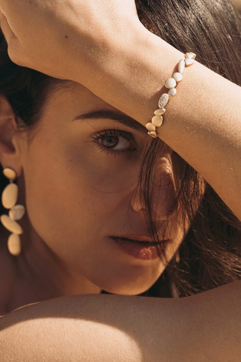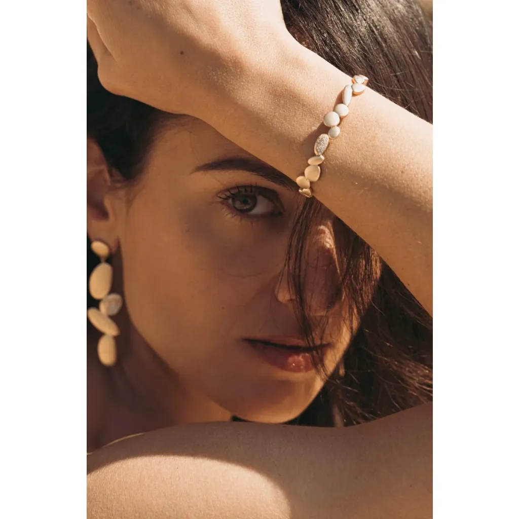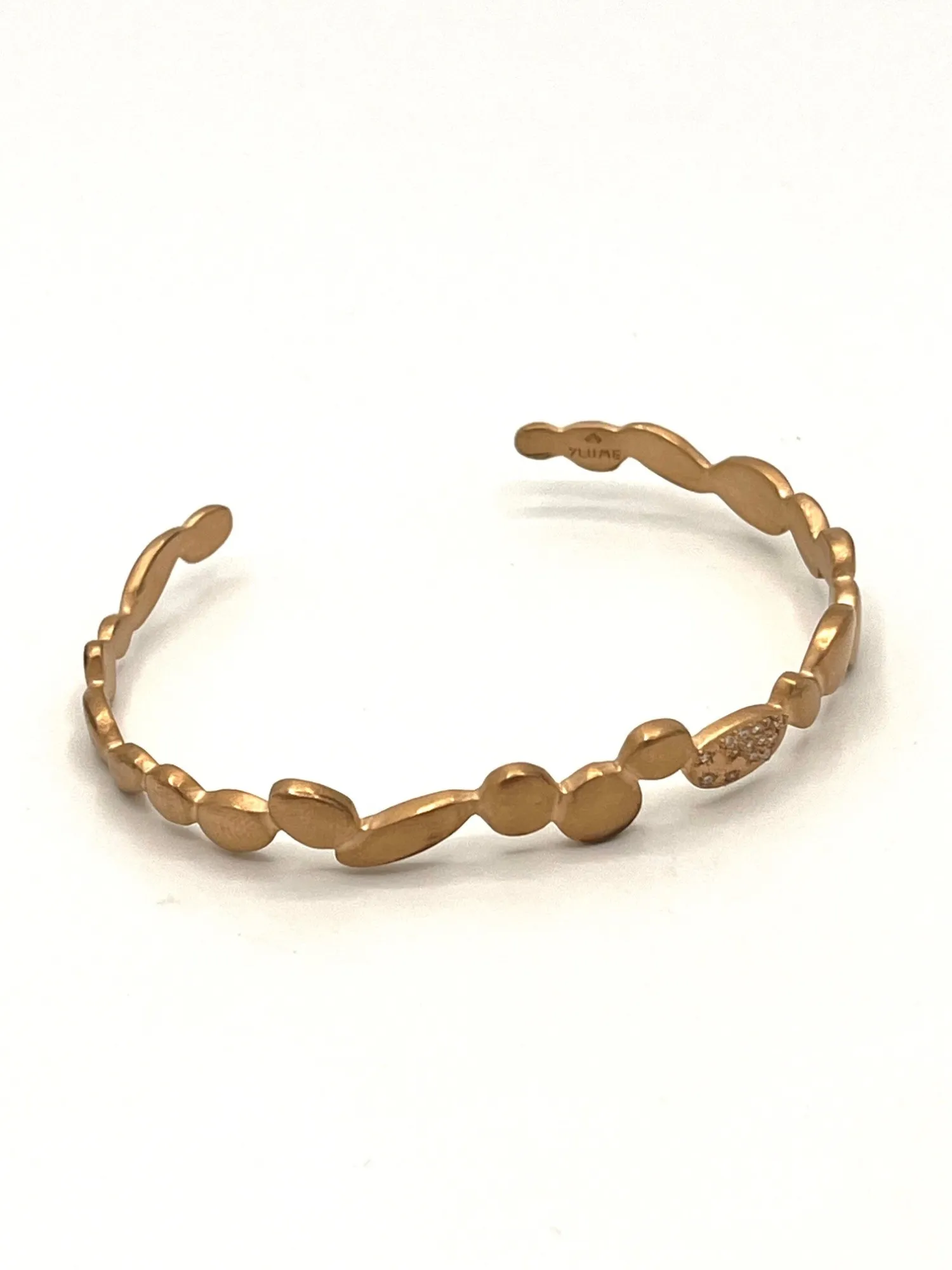 Évoquant à la fois raffinement et modernité, ce bracelet jonc en plaqué or 18 carats est une création qui incarne la délicatesse des bijoux artisanaux. Imaginé à Aix en Provence, son design soigné illustre un savoir-faire local remarquable. Le bracelet, d'un doré champagne mat, se distingue par sa simplicité empreinte de grâce, tandis que ses zircons incrustés captivent par leurs éclats scintillants, rappelant des constellations étoilées.