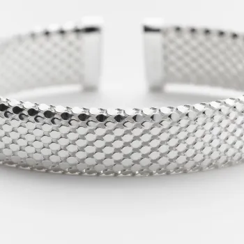 Le bracelet Margotte, une création française élégante de Canyon, est fabriqué en argent 925. Ce bangle ouvert plat et souple est décoré de petites écailles, se terminant par un bourrelet en décoration, et s’ajuste facilement grâce à son ouverture comme un jonc.