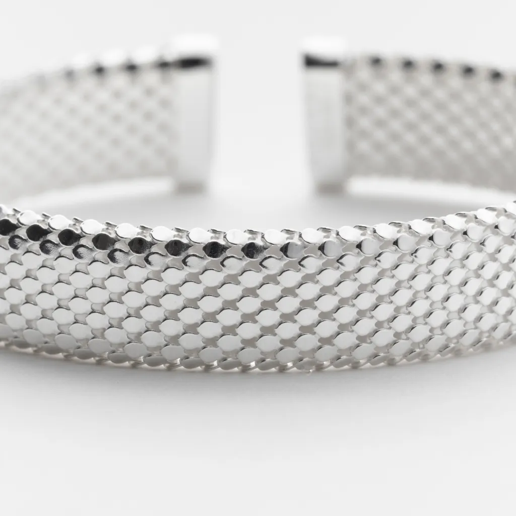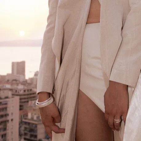 Mesurant 5.5 cm de longueur et 5 cm de largeur, le bracelet est facilement ajustable grâce à son ouverture, à la manière d’un jonc, permettant un confort personnalisé tout en conservant une élégance subtile. Confectionné à partir d'argent 925, il assure une brillance durable et est parfaitement adapté aux peaux sensibles grâce à ses propriétés hypoallergéniques.