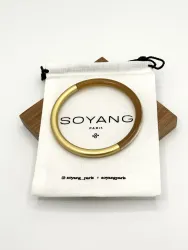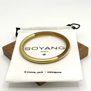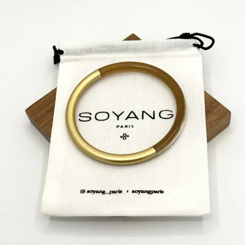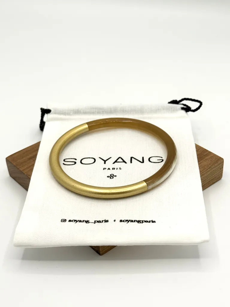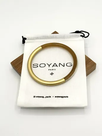 Imprégnez-vous de l'élégance intemporelle avec ce jonc fin laque blanc/doré, une création exquise de la maison française Soyang. Chaque bijou est méticuleusement façonné à partir de corne de buffle et de zébu, témoignant d'un engagement fort envers des pratiques durables et respectueuses de l’environnement.