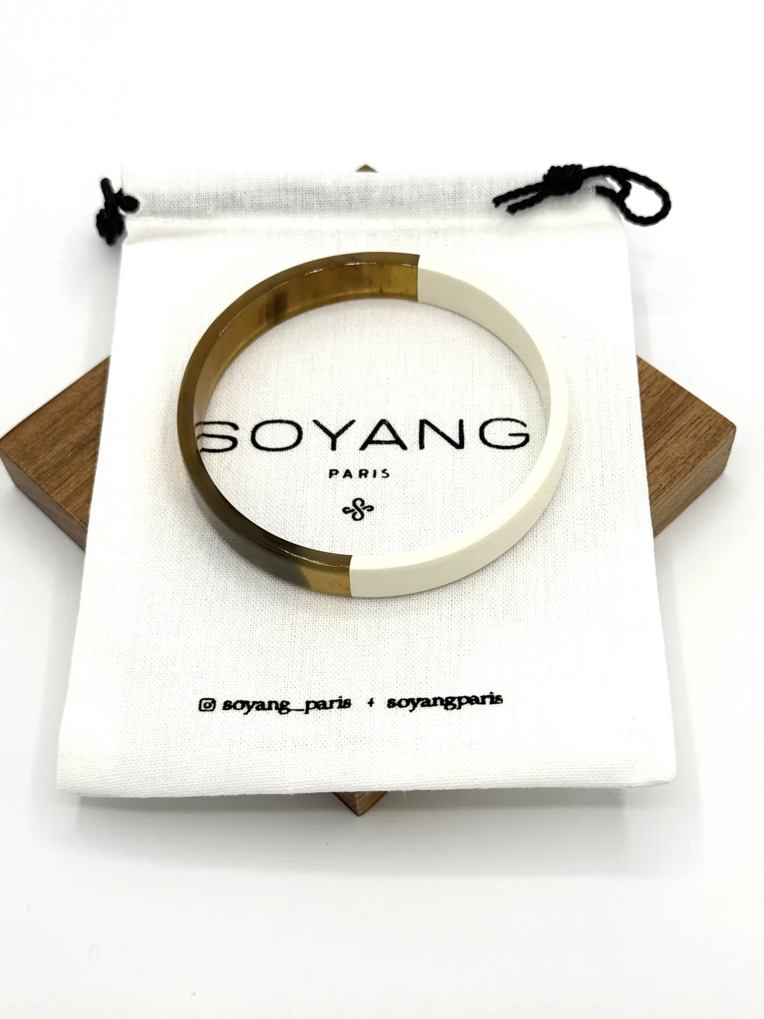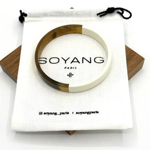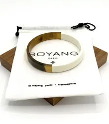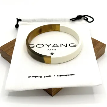 Raffinement et nature se rencontrent avec le Jonc Large Laque Blanc de Soyang Paris. Confectionné à partir de corne recyclée de buffle et de zébu, ce bijou incarne une élégance intemporelle. Disponible en tailles S, M, et L.