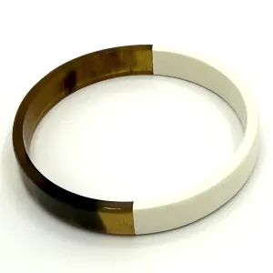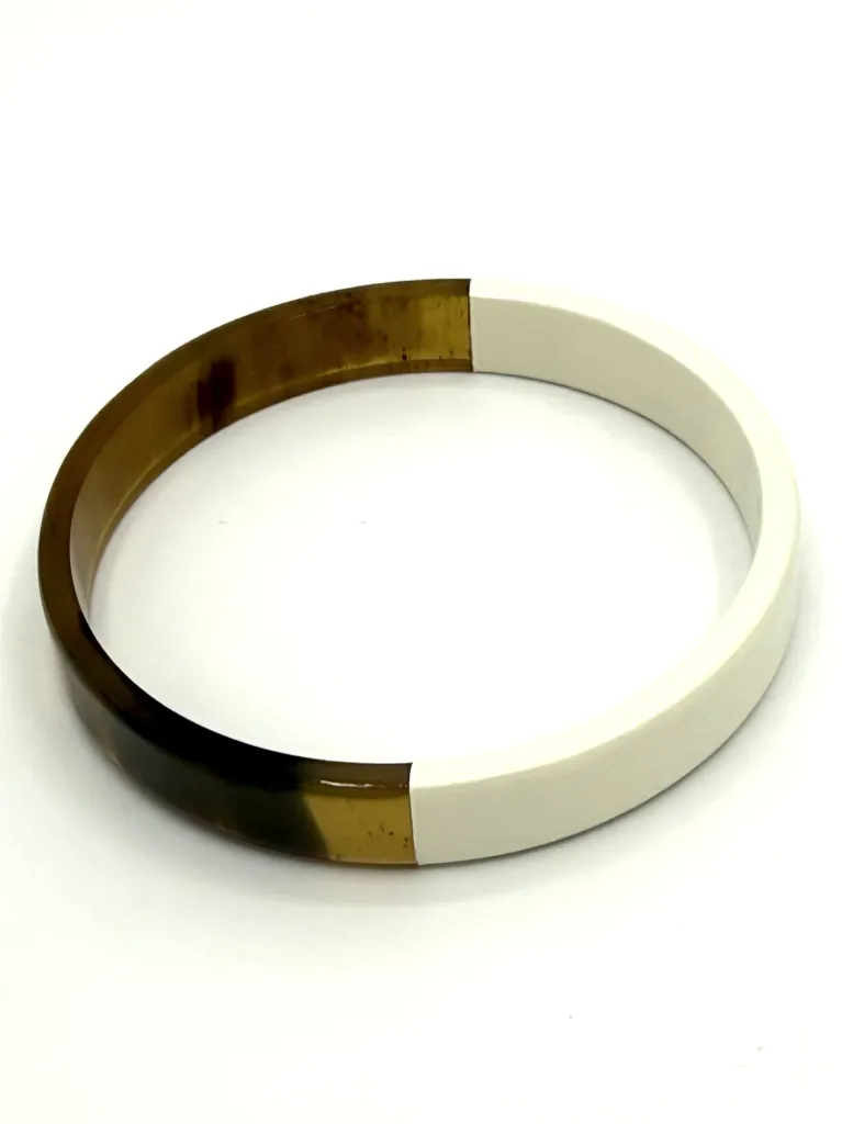 Ce jonc large se distingue par sa finition en laque blanche somptueuse, qui illumine la texture organique de la corne sous-jacente. La pureté du blanc, appliquée avec soin, confère au bijou une sophistication discrète qui s’adapte à toutes les occasions, du quotidien aux événements plus formels.