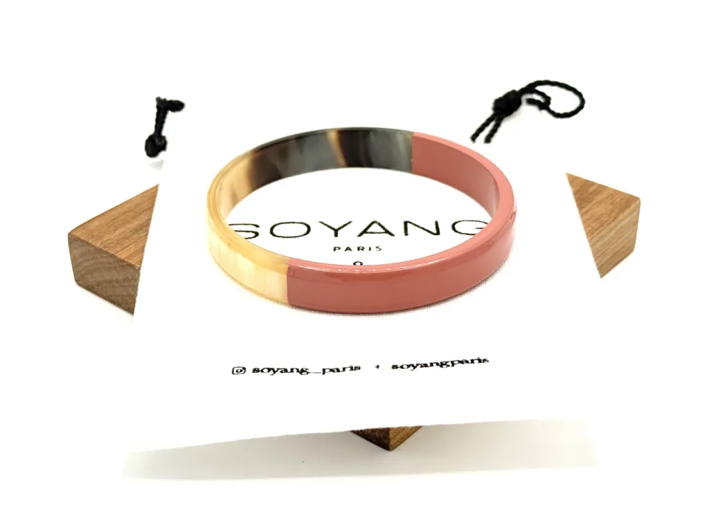 Le Jonc Large Laque Rose est une pièce d'exception qui illustre parfaitement l'harmonisation entre la nature et le luxe contemporain. Conçu par les artisans talentueux de Soyang Paris, ce bijou est réalisé à partir de corne de buffle et de zébu domestiques, des matériaux écologiques et durables qui racontent une histoire de respect pour la planète.