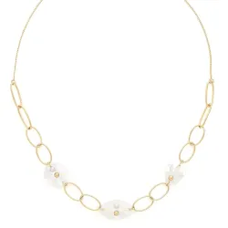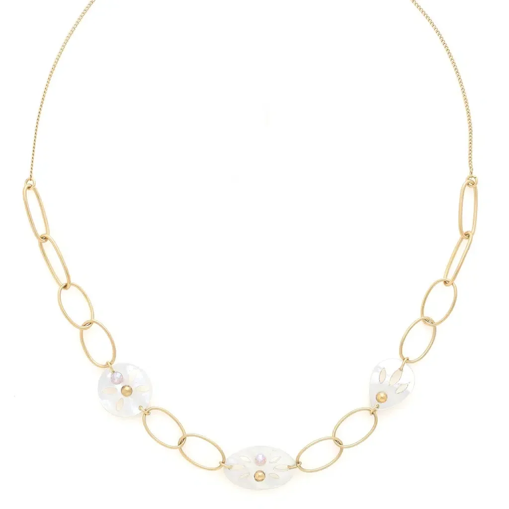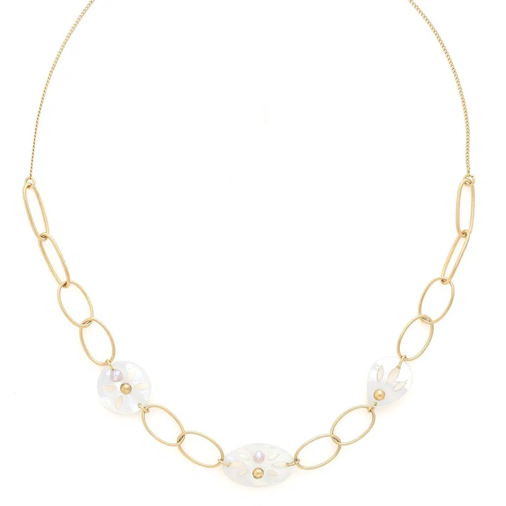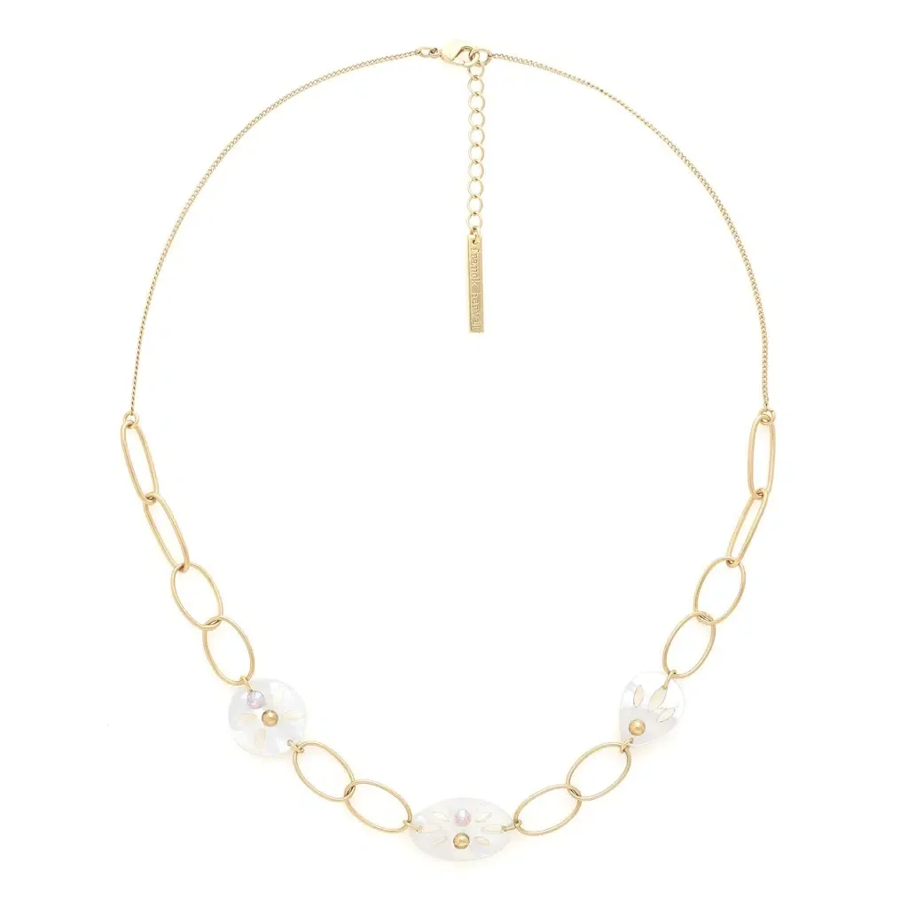 Le collier Angélique, une création raffinée de Franck Herval, éblouit par son élégance. En laiton délicatement doré à l'or fin et rehaussé de nacre blanche, ce bijou de 42 cm apporte une touche de sophistication intemporelle à votre style.
