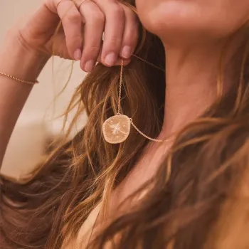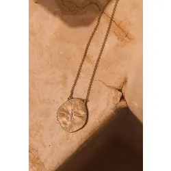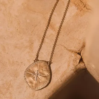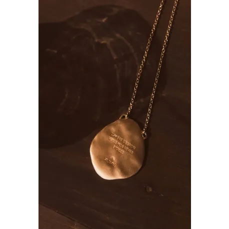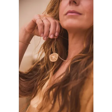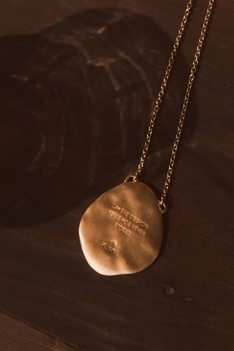 Découvrez le collier médaille de Ylume, une création empreinte de poésie et de raffinement. Ce bijou en plaqué or 18 carats sur laiton, avec une finition dorée champagne mate, incarne l'élégance intemporelle associée à un message profond. Sa médaille présente une étoile gravée, éclatante de zircon, symbolisant l'éclat des rêves et des espoirs. Au dos, l'inscription "lumière d'espoir veille sur nos rêves étoilés" vous accompagne comme un mantra personnel.