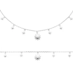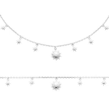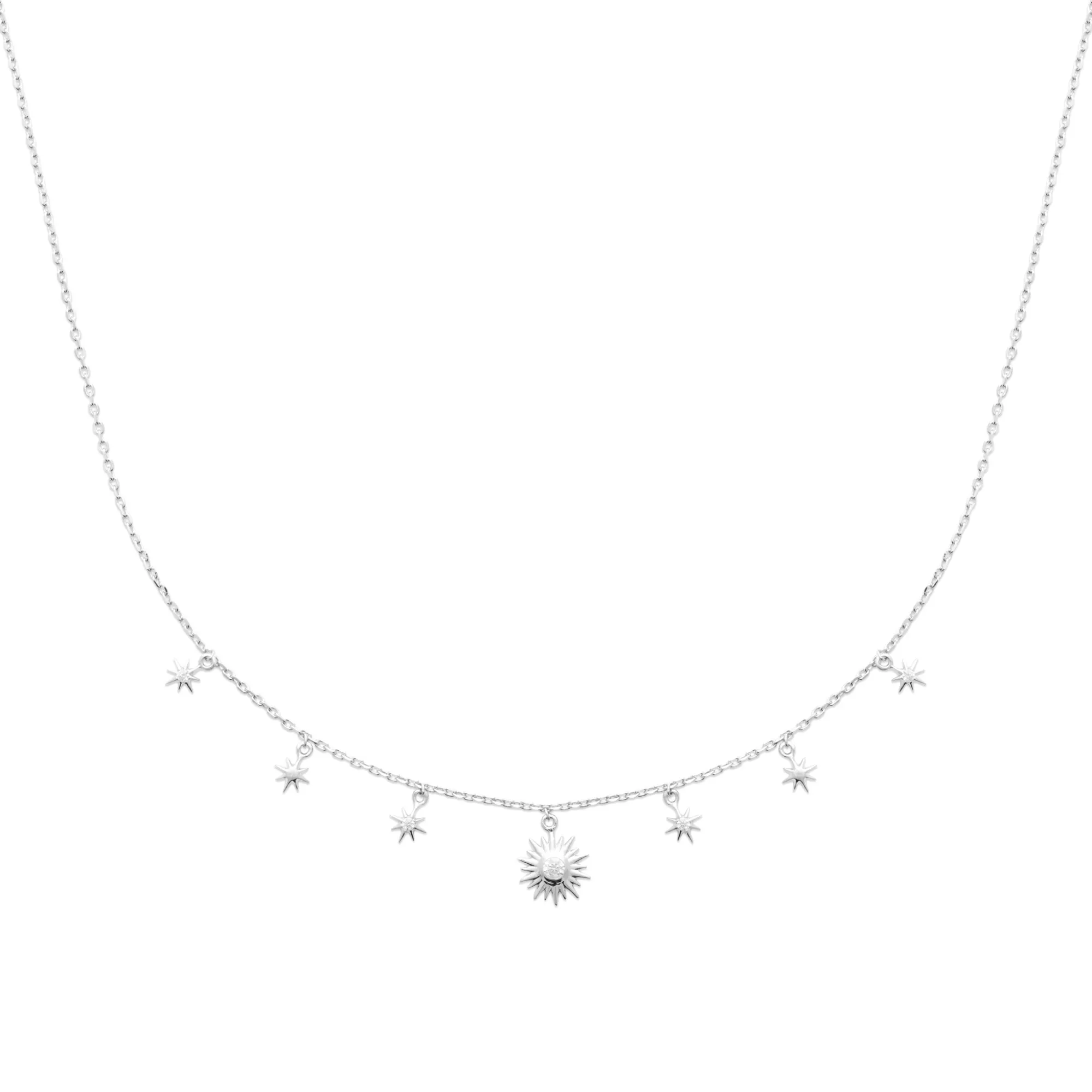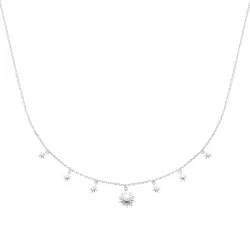 Illuminez votre style avec le Collier Éclat Solaire en argent, orné de pendentifs solaires harmonieux, couronné par un majestueux soleil central.