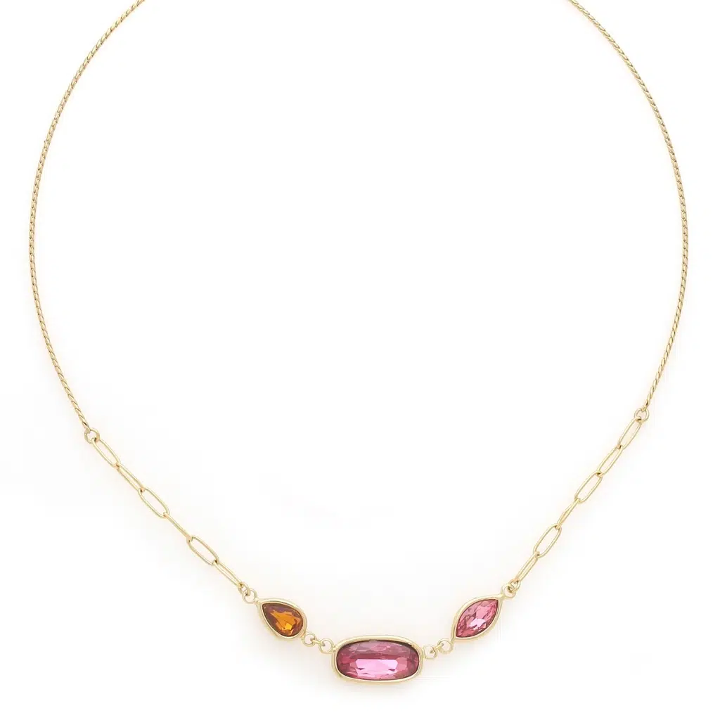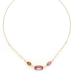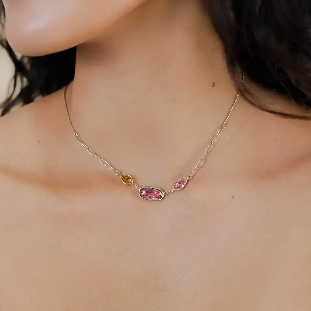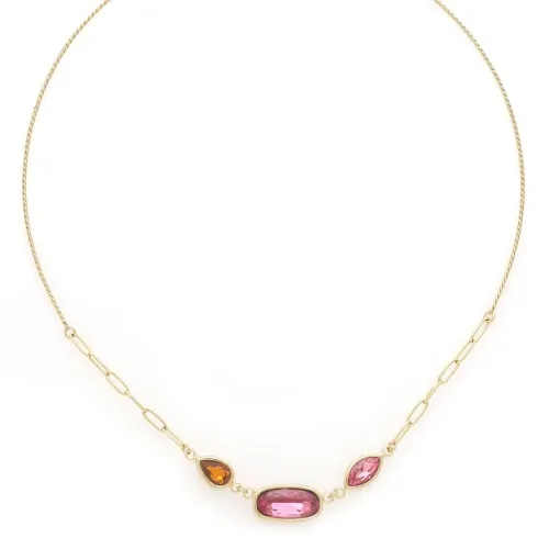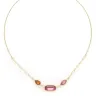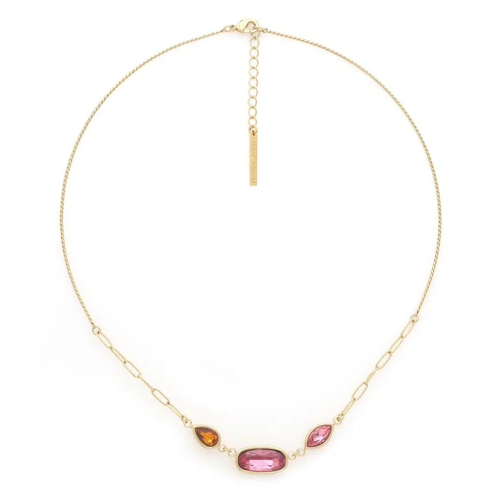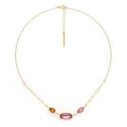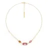 Adoptez l'élégance du collier Emy, une création artistique française de Franck Herval. Ses pétales façon pierre fine aux teintes rose et orange forment des fleurs graphiques, sublimant votre décolleté avec finesse. Ce bijou est fabriqué en laiton de qualité, garantissant raffinement et durabilité.
