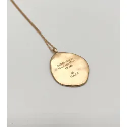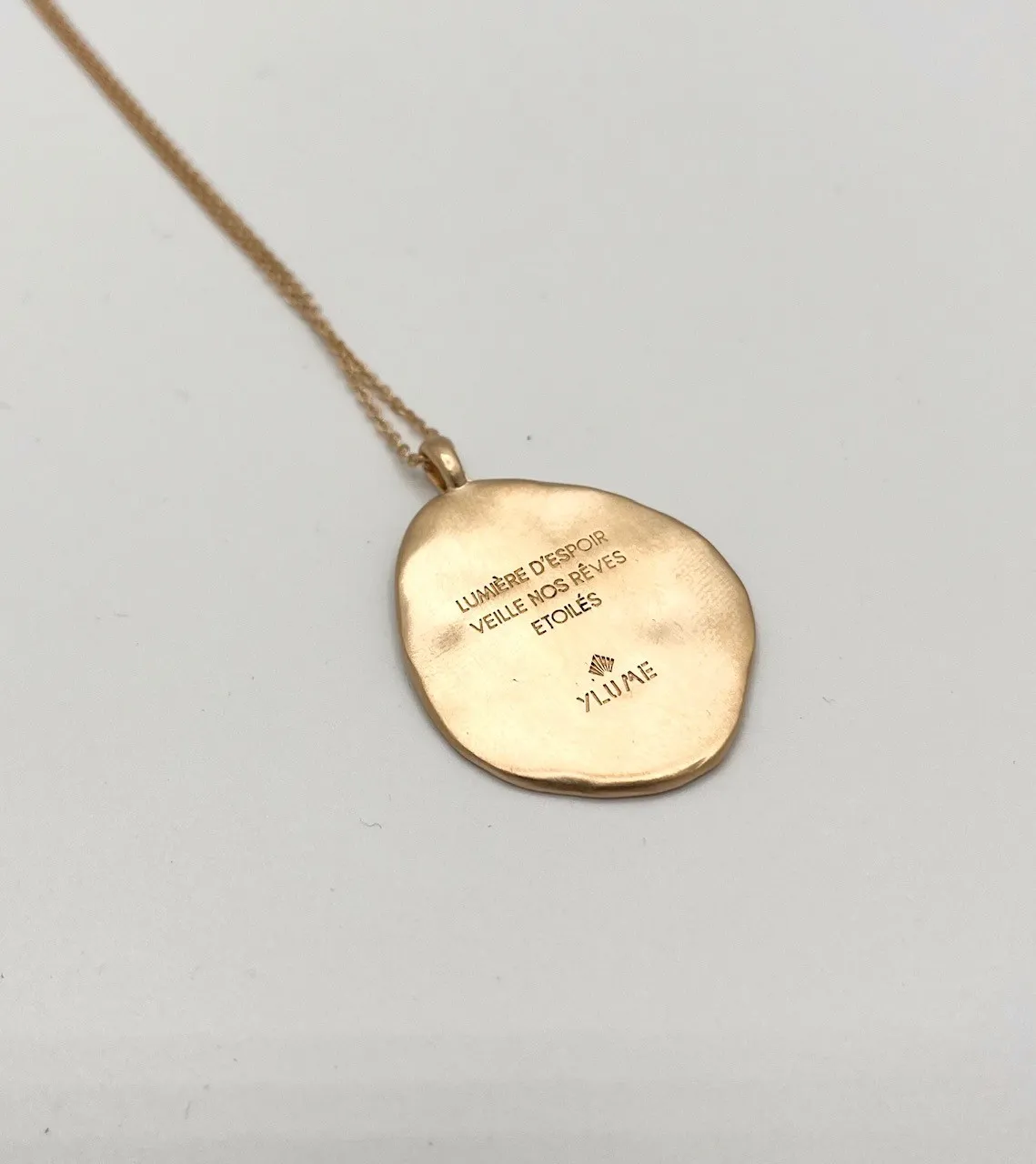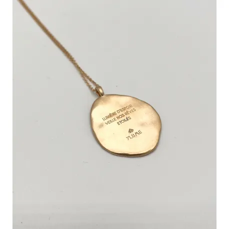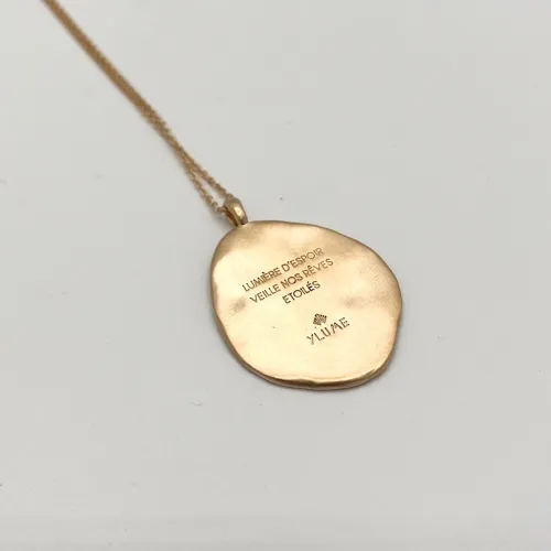 Succombez à la beauté du collier médaille sautoir en plaqué or 18 carats, un bijou qui incarne à la fois élégance et subtilité. Son design, imaginé à Aix en Provence, témoigne d'un savoir-faire artisanal remarquable, offrant une pièce harmonieuse et moderne. La médaille présente une étoile gravée sur sa face, un détail qui capte la lumière et symbolise l'infini et les rêves. Au dos, des mots choisis murmureront leurs messages secrets contre votre cœur.