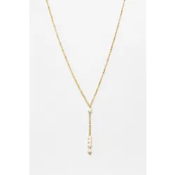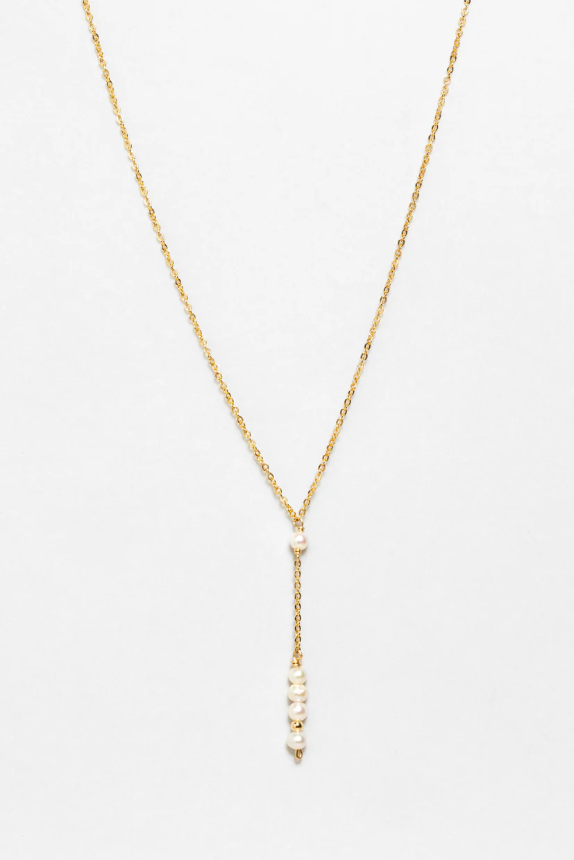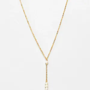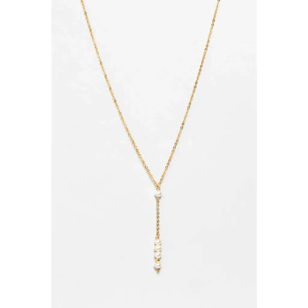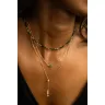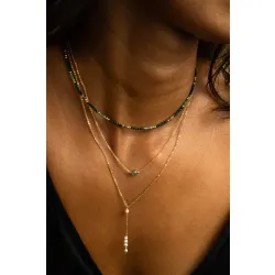 Le collier long cravate de la marque YAY est une création élégante qui met en valeur le décolleté avec son pendentif unique composé de pierres naturelles et une perle d'or, offrant un contraste lumineux et précieux.