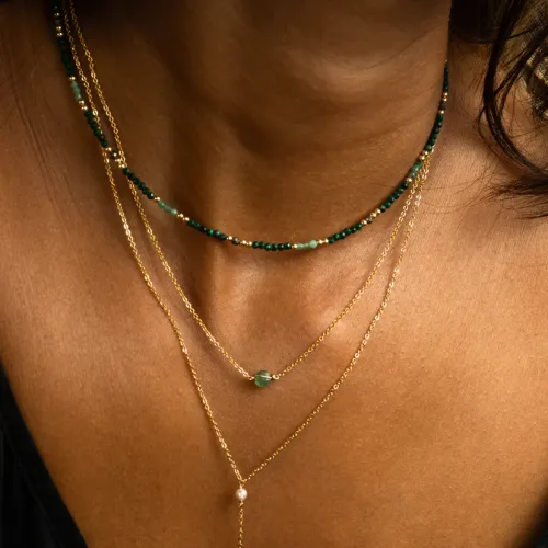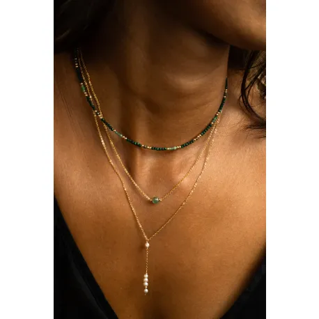 Les pierres naturelles, mesurant 2 mm, sont soigneusement sélectionnées pour leur éclat et leur qualité exceptionnelle. Façonnées par la nature, elles apportent au bijou des nuances subtiles et variées qui soulignent son unicité. La perle d'or ajoute une touche précieuse et luminescente, assurant un équilibre élégant entre modernité et tradition.