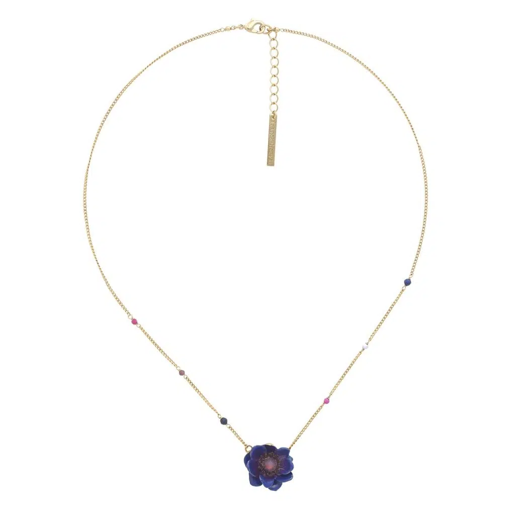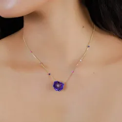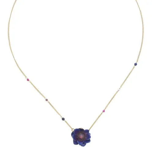 Le collier est orné de perles de verre pétillantes et de magnifiques fleurs bleu violet réalisées en résine colorée, évoquant sérénité et inspiration artistique. La fleur, en plus d’apporter une élégance florale, sont un clin d'œil à la nature et à sa beauté intemporelle.Le Collier Mélina est idéal pour sublimer vos tenues, qu'il s'agisse de donner une touche de sophistication à un ensemble décontracté ou d'ajouter du chic à une tenue de soirée.