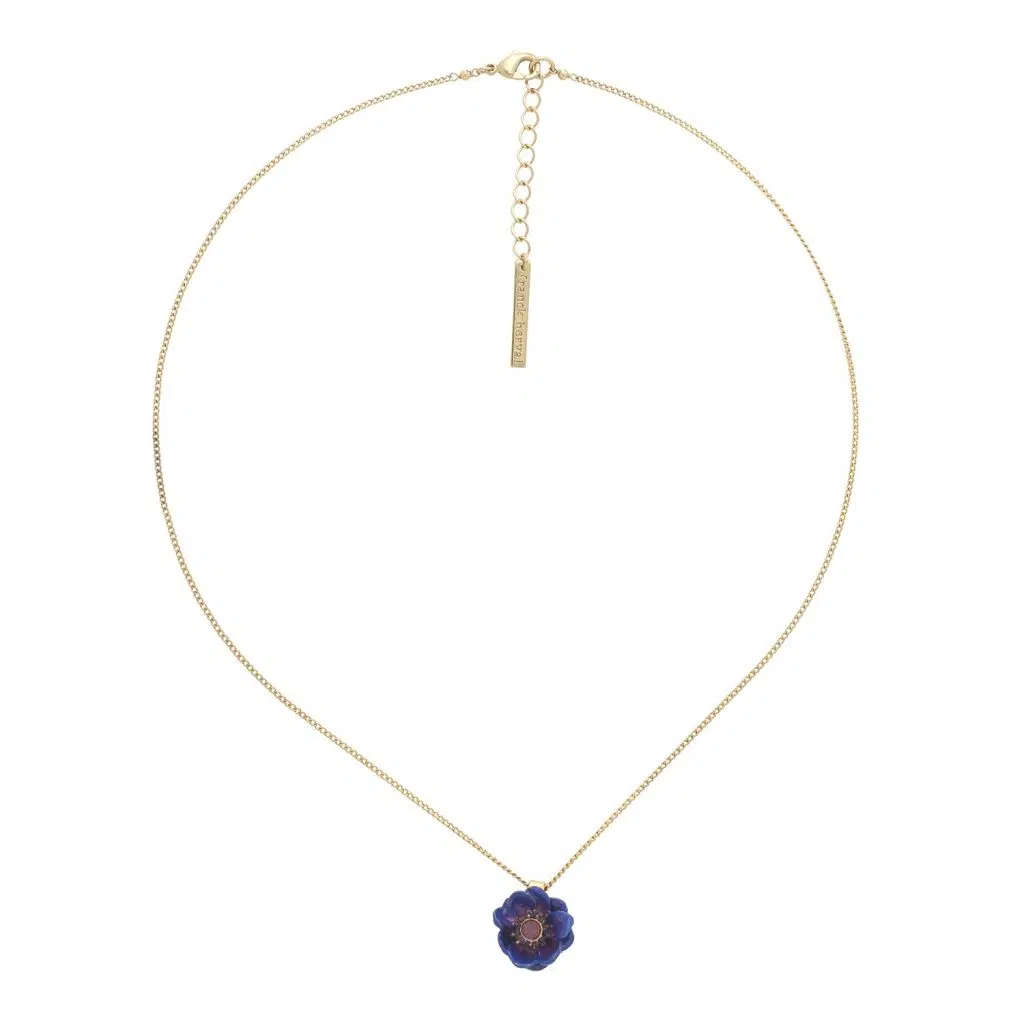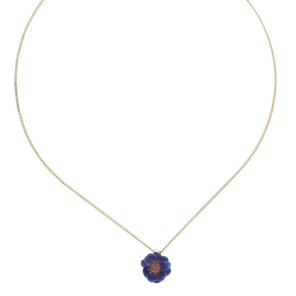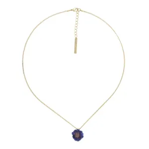 Le Collier Mélina est une œuvre d'art délicate, conçue par Franck Herval. Ce collier de 42 cm met en avant une fleur bleu violet réalisée en résine colorée, montée sur une base en laiton, incarnant l'élégance de la création française.
