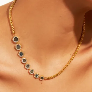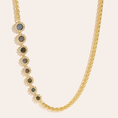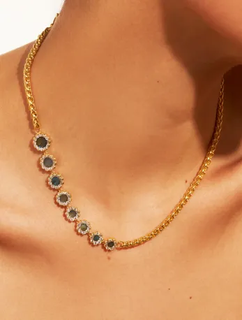 Le collier Rive d'Or Labradorite est une pièce exceptionnelle qui mélange avec raffinement la modernité et le charme intemporel des pierres naturelles. Fruit du savoir-faire de Be Maad, ce collier est fabriqué en laiton doré à l'or fin 18K, offrant une brillance sophistiquée à toute tenue.