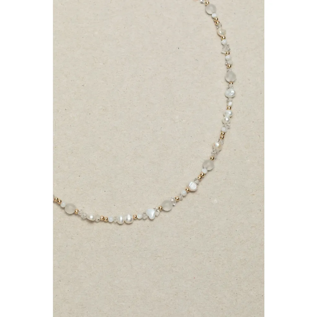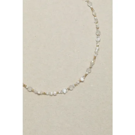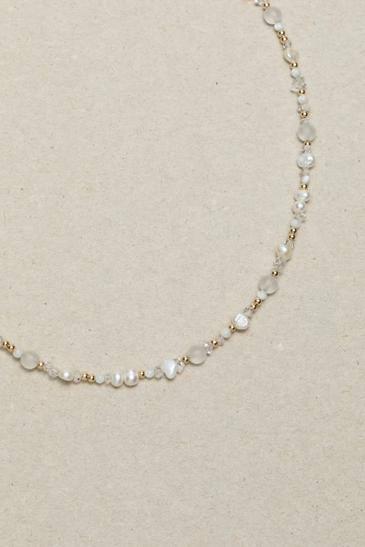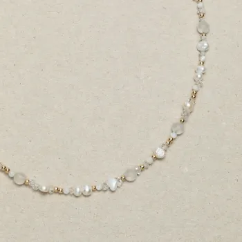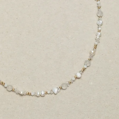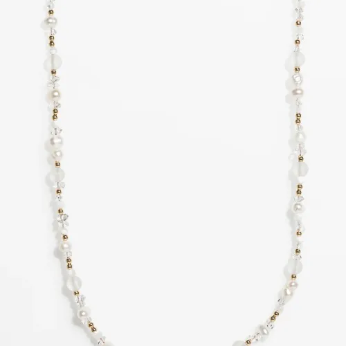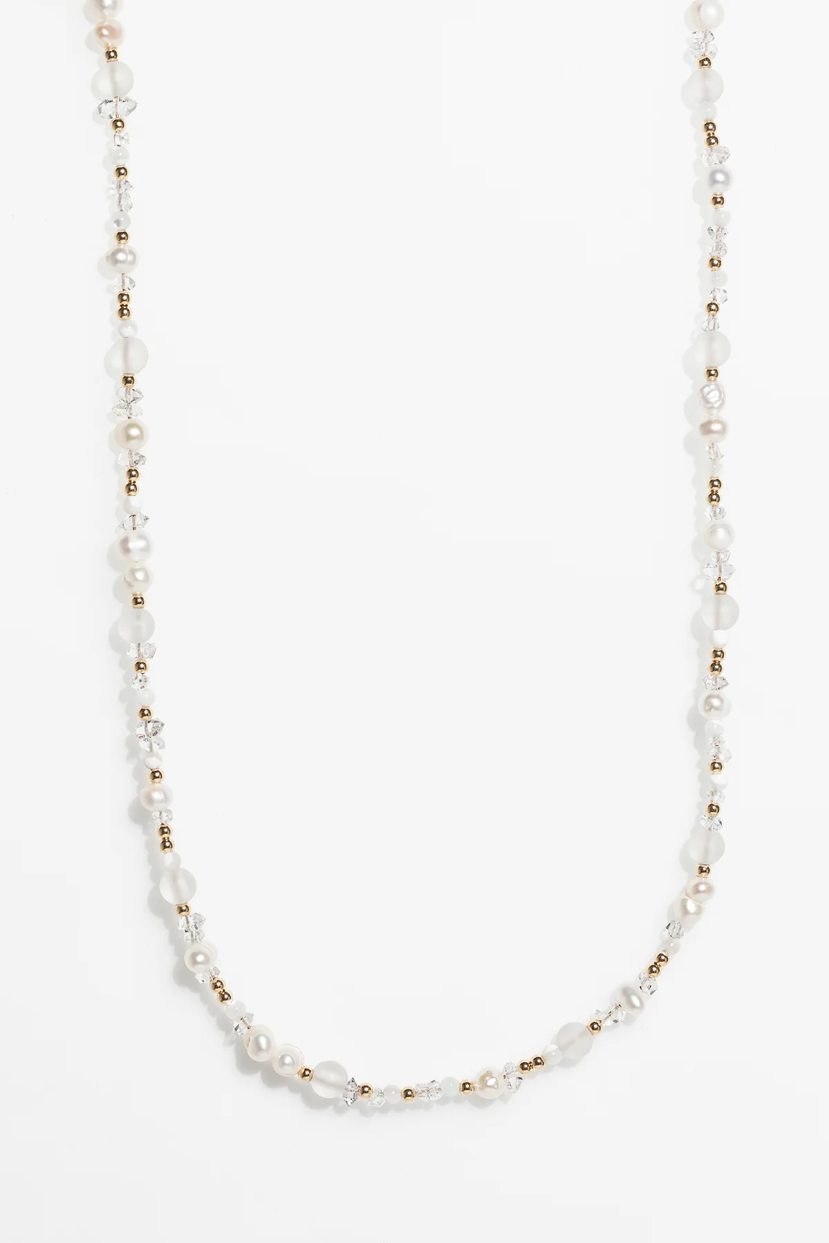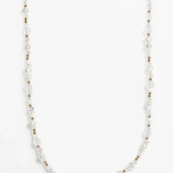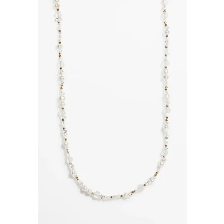 Le collier met en avant des perles de culture et des cristaux de roche aux dimensions variées, de 2 à 4 mm, qui témoignent d'une sophistication discrète et naturelle. La perle de culture, symbole de pureté, est magnifiquement mise en valeur par le cristal de roche, connu en lithothérapie pour sa capacité à amplifier les énergies et apporter clarté et sérénité.