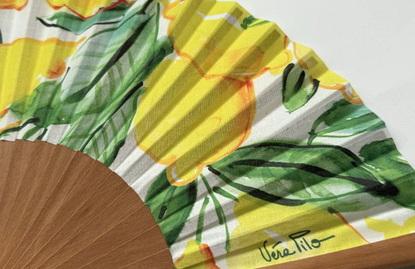 Fabriqué avec une attention scrupuleuse aux détails, l'éventail Limona reflète le savoir-faire artisanal et la qualité exceptionnelle de ses matériaux. Monture en bois de poirier, poli à la main. Feuille en coton 100% imprimé. Création française. Assemblés à la main par nos familles en Espagne et contrôlé dans nos ateliers en France.