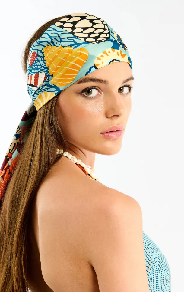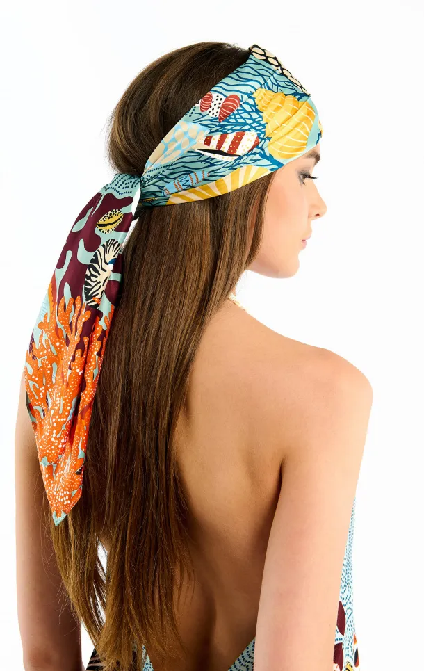 Embarquez pour une aventure sous-marine avec le foulard Wild Coral bleu. Ses motifs inspirés des récifs coralliens apportent une touche rafraîchissante et élégante à votre style.