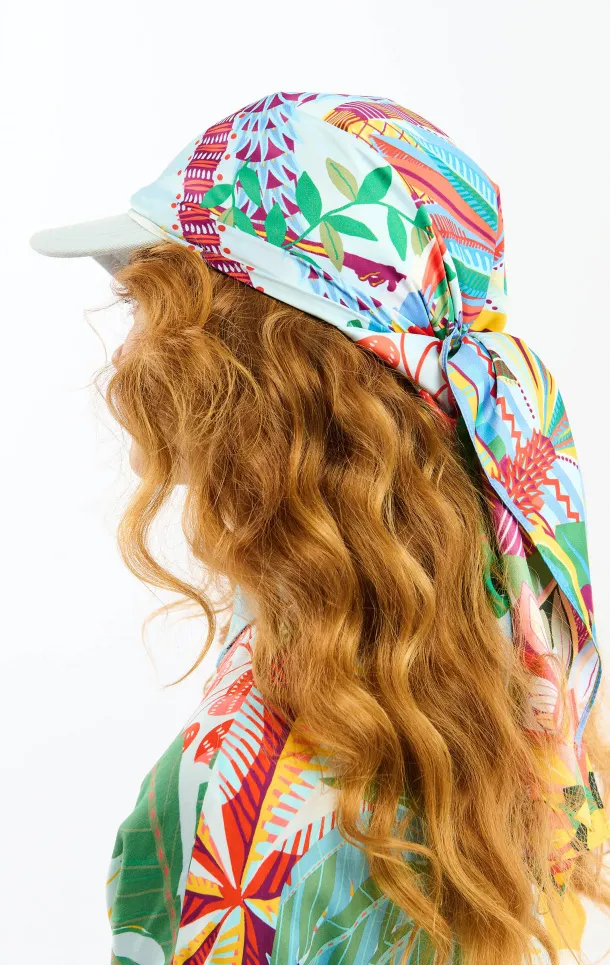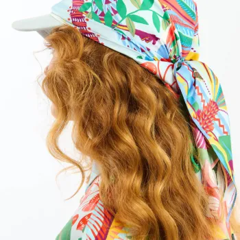 Confectionné en 100% polyester recyclé, il enveloppe doucement le cou grâce à sa texture douce et légère. Polyvalent et élégant, sa taille de 90x90 cm le rend idéal pour être porté de multiples façons : autour du cou, dans les cheveux, ou comme accessoire de sac, il égaye instantanément toute garde-robe.
