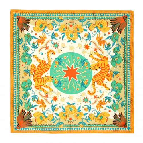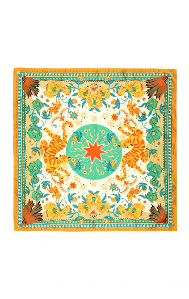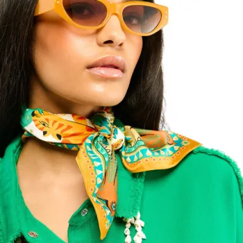 Invitez une vague d’audace et de couleur dans votre style avec le mini foulard Wild Bandidas vert. Cette création française à partir de polyester recyclé combine finesse et motifs exotiques, entre tigre docile, fleurs estivales et inspirations mexicaines.