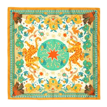 Son vert vibrant évoque la prospérité de la nature, tandis que ses motifs soigneusement dessinés mettent en scène un tigre docile et coloré entouré de fleurs estivales. Ces éléments, combinés avec une esthétique inspirée par la richesse du folklore mexicain, offrent une toile vivante et captivante qui ne manquera pas de faire tourner les têtes.