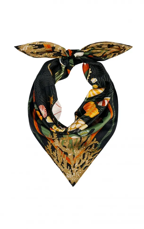 Adoptez une élégance stylée et écologique avec le mini foulard Wild Coral noir. Sophistiqué et responsable, ce foulard création française dévoile des motifs envoûtants de fonds marins et de corail.