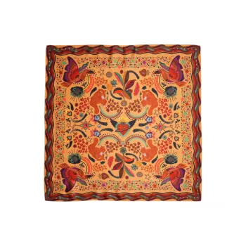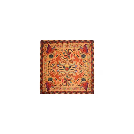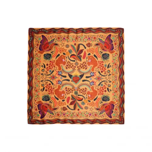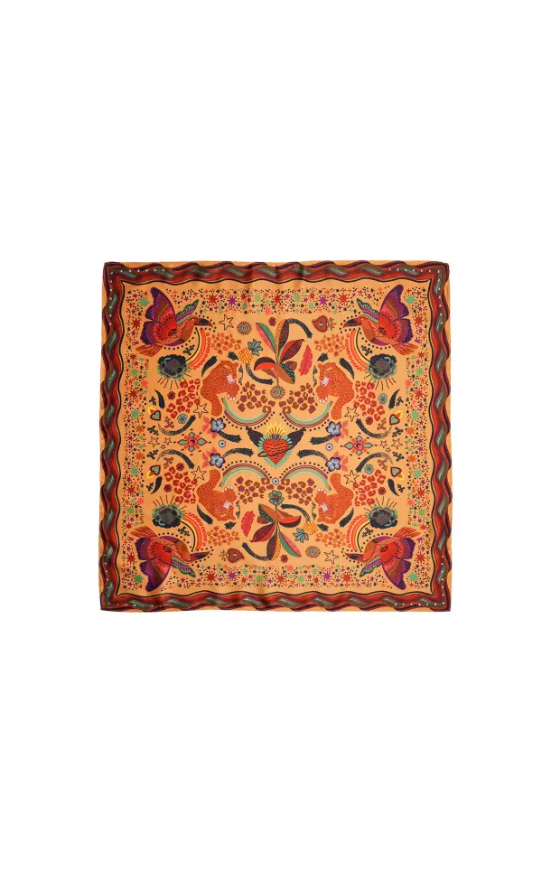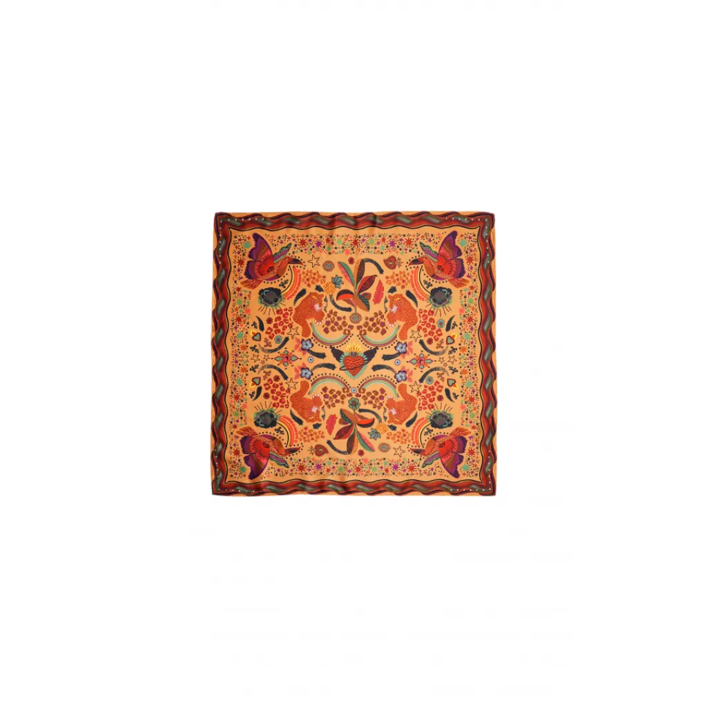 Plongez dans l'univers enchanteur du Mini Foulard Crazy World de Wild, une pièce qui unit art et mode dans un format compact de 55 x 55 cm. Ce foulard présente des imprimés saisissants d'animaux fantastiques, tels que des guépards tatoués et des phœnix avec des becs de toucan, entrelacés avec des étoiles multicolores et des motifs oniriques. Il offre une plongée dans un monde mystique, enrichi de symboles joyeux et lumineux.