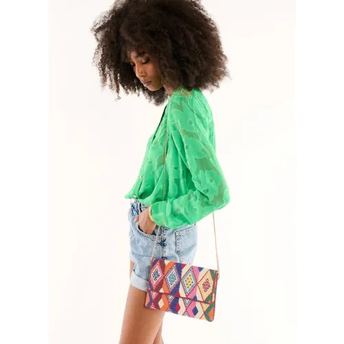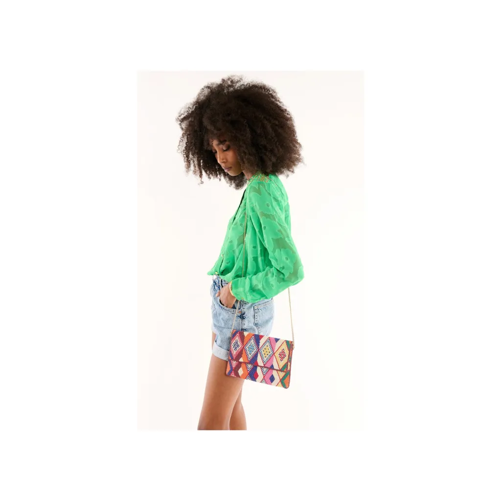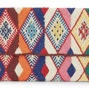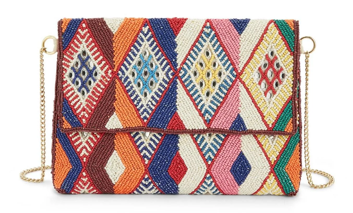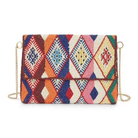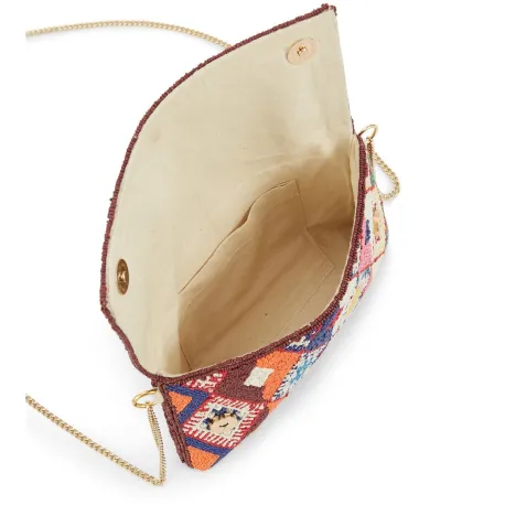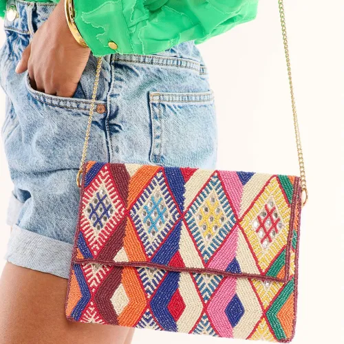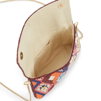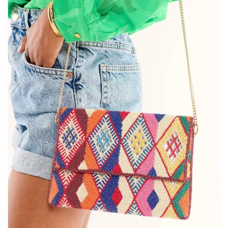 Adoptez l'élégance bohème du sac pochette WILD, entièrement perlé de motifs kilim multicolores. Idéal pour une touche artistique et sophistiquée à vos tenues.