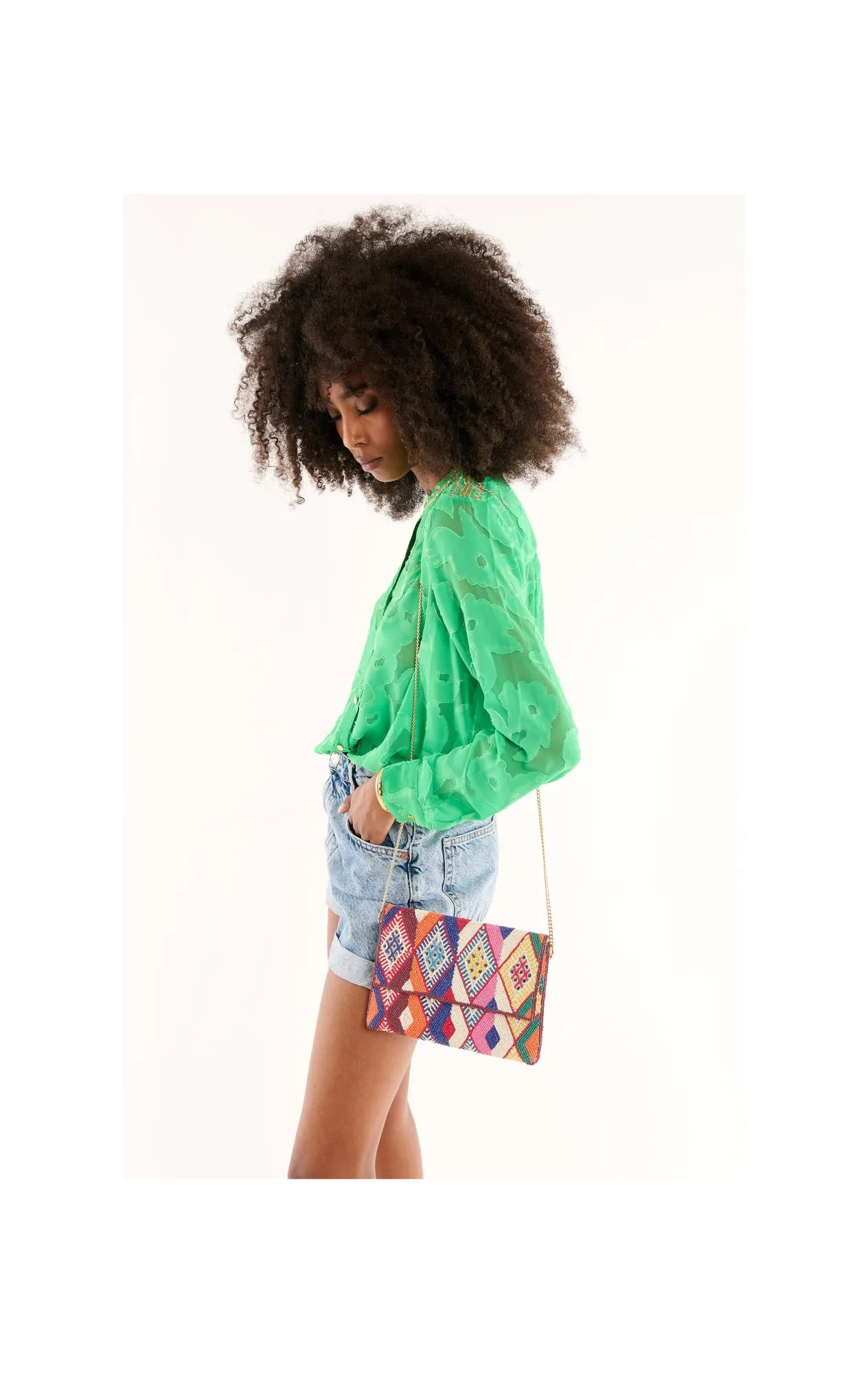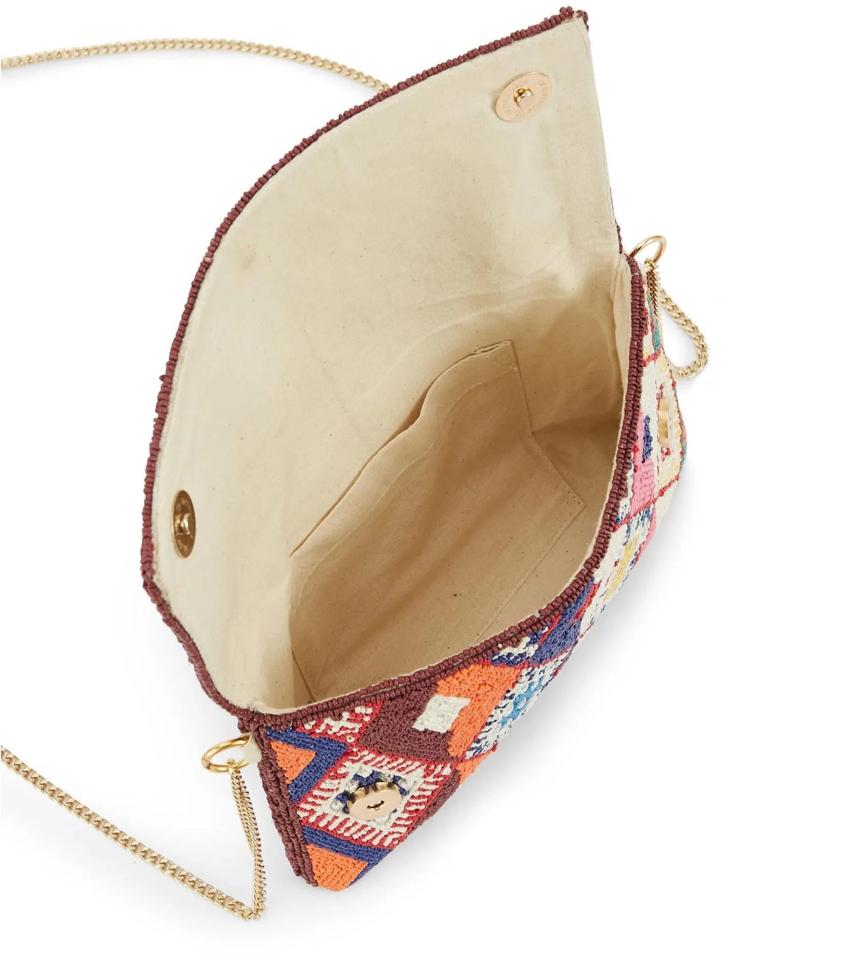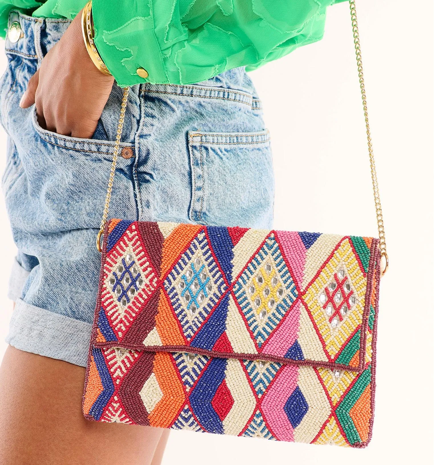 Adoptez l'élégance bohème du sac pochette WILD, entièrement perlé de motifs kilim multicolores. Idéal pour une touche artistique et sophistiquée à vos tenues.